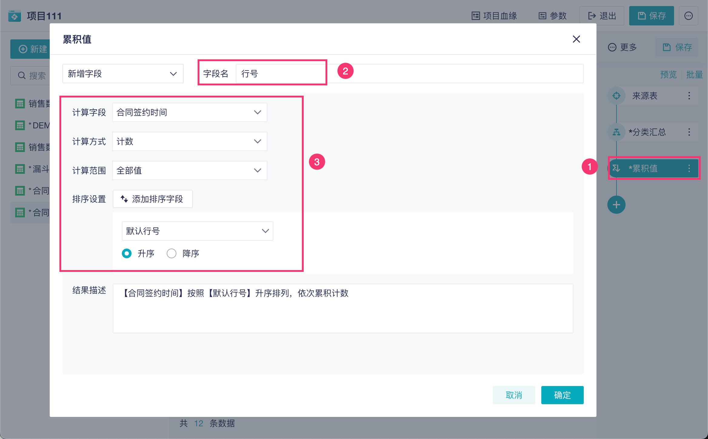 | 排序设置 | 输出的结果会先根据该字段进行排序,再进行累积值计算。如需多个排序依据,可点击「添加排序字段」设置多个字段。 注:在字段列表最下方,会有一个默认字段:「默认行号」,记录的是上一个步骤的行号顺序,实际应用可参考本文第 3 节。 本文示例是要计算从 1 月到 12 月的累积合同金额,那么就对「合同签约」时间进行升序排列。 |