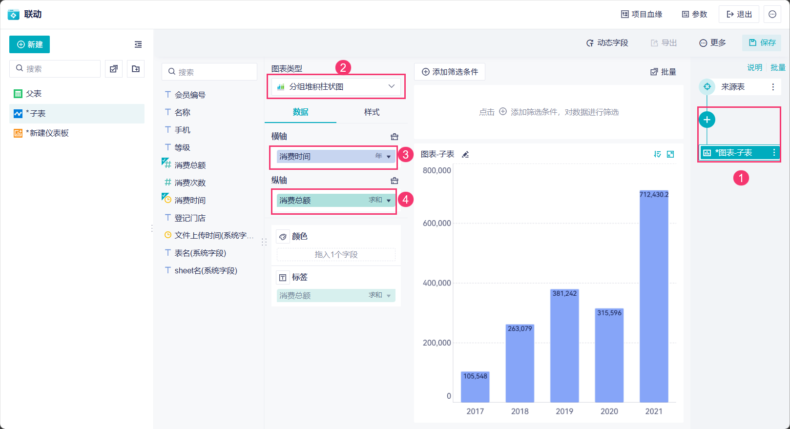 3)选择制作一张柱形图,将「消费时间」按「年」分组,展示每年的消费额。如下图所示:
