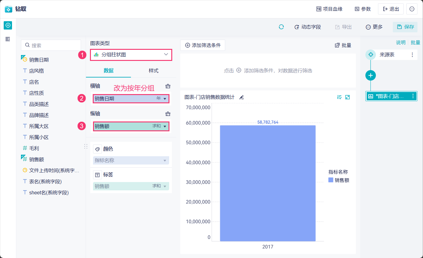 3)选择柱状图,将「销售日期」字段拖入维度栏,将「销售额」字段拖入指标栏,将「销售日期」字段按照「年」分组。如下图所示: