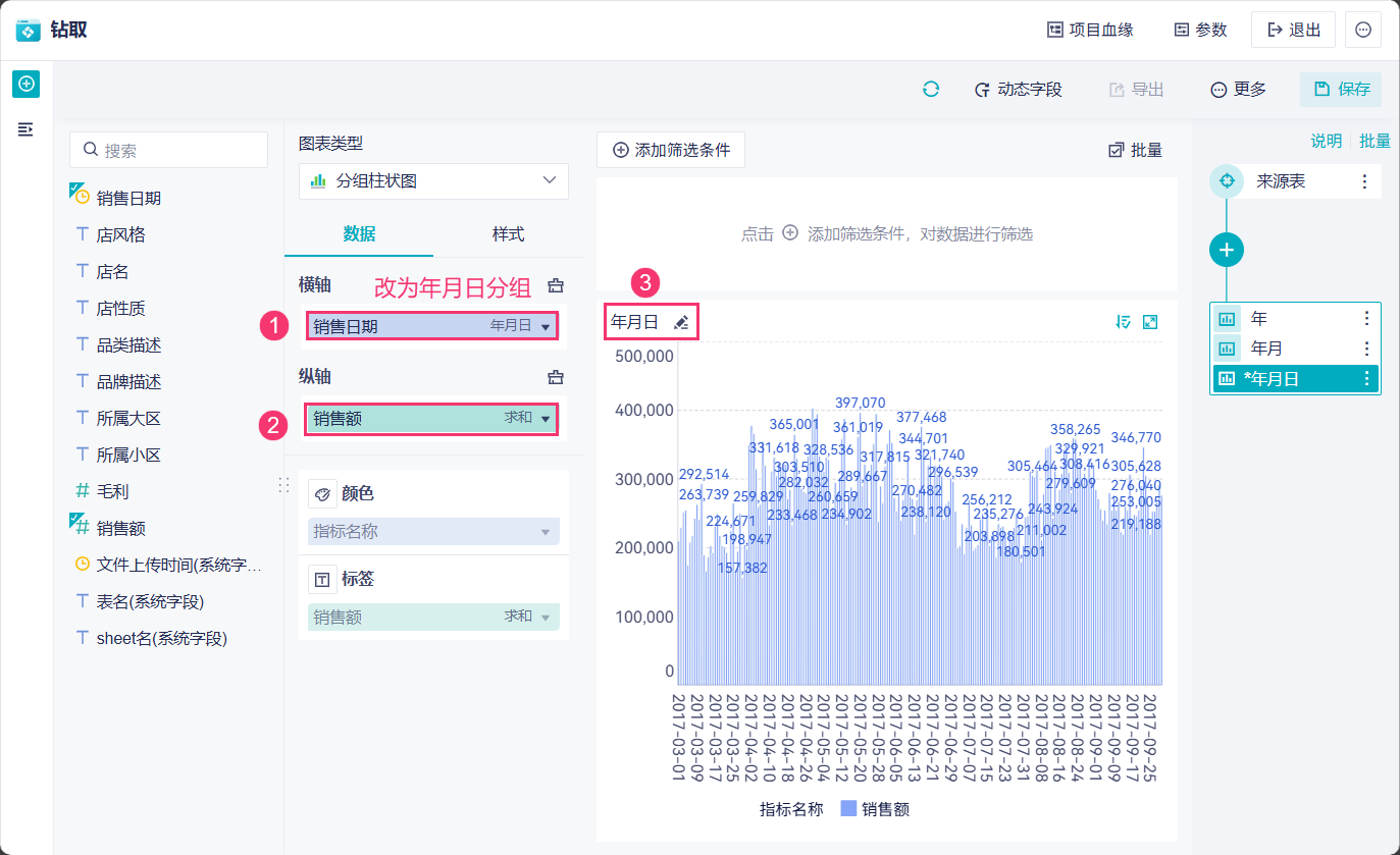 要实现「年-年月-年月日」的钻取层级,需要先制作三张图表,将日期字段分别按照 年/年月/年月日 分组,然后在仪表板中设置钻取层级。