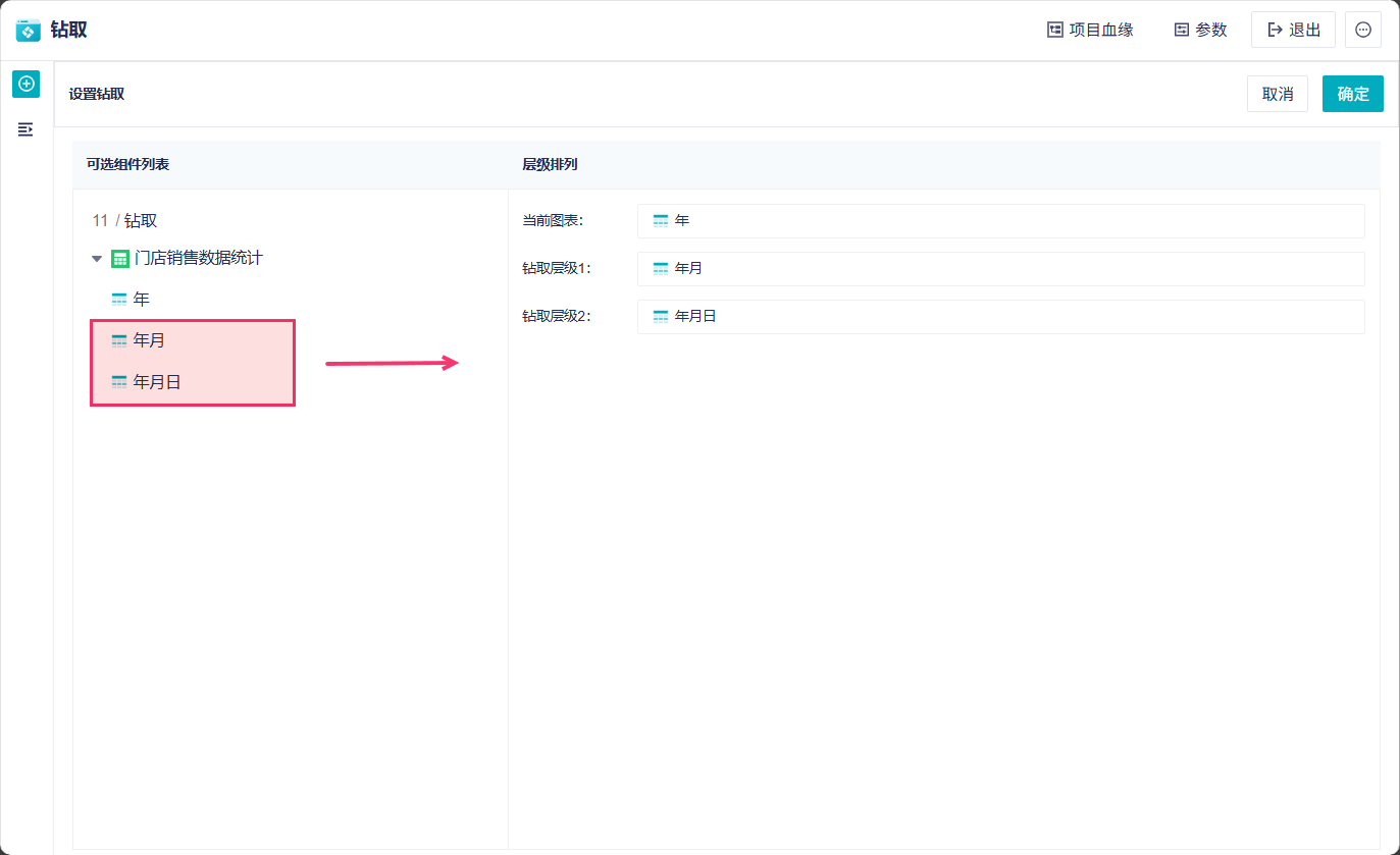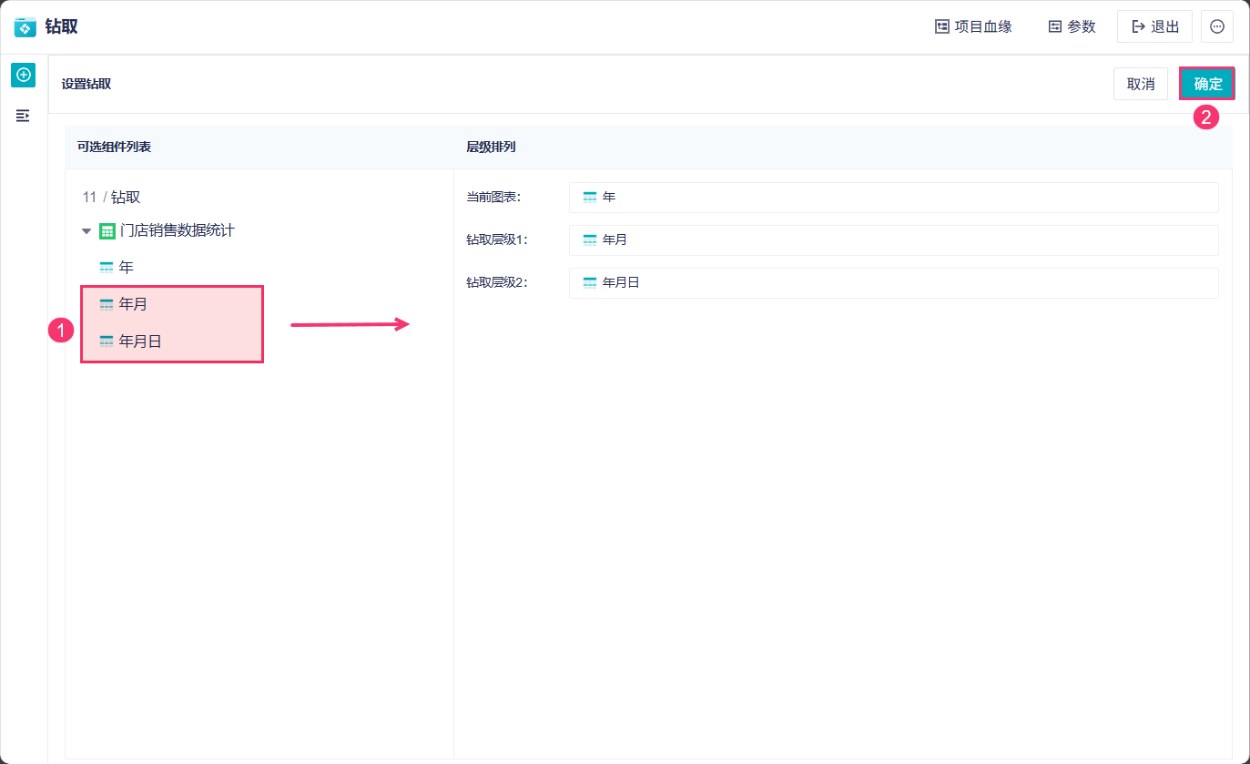 2)进入钻取设置面板中,将「年月」、「年月日」图表依次拖入面板中,按照钻取层级排列。如下图所示: