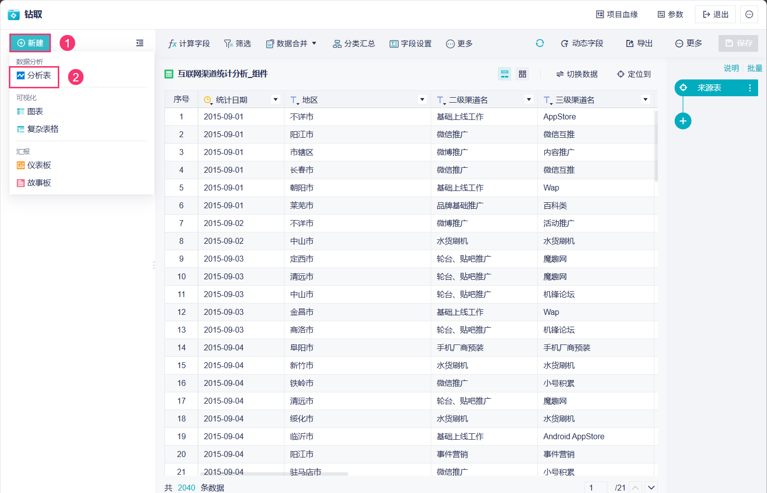 1)下载并上传示例数据,将数据保存在项目中,使用示例数据创建分析表,如下图所示: