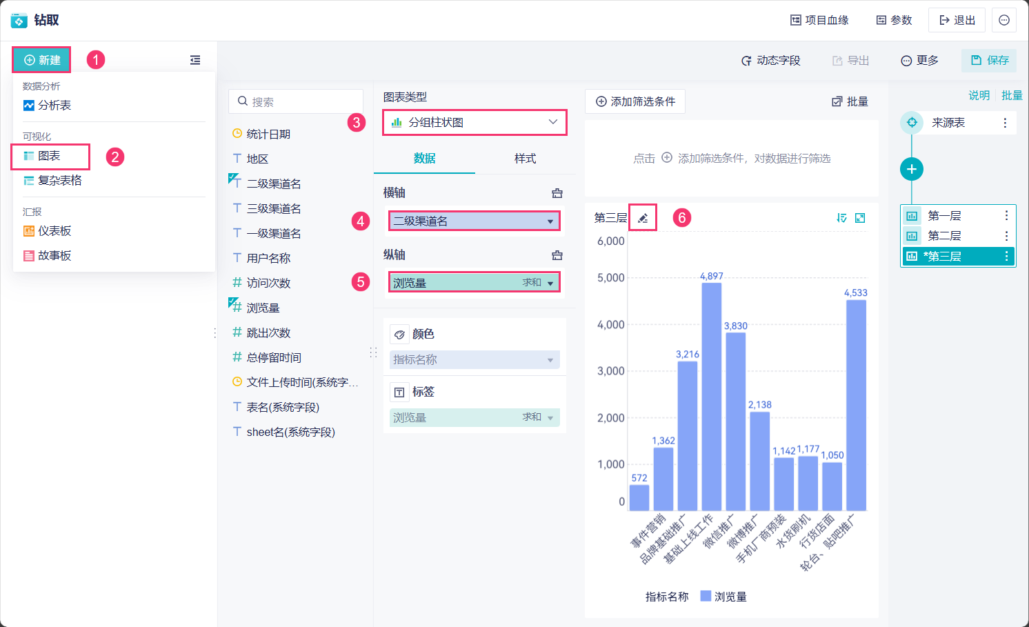 6)制作「二级渠道名」层级的柱状图,将图表名称改为「第三层」,如下图所示: