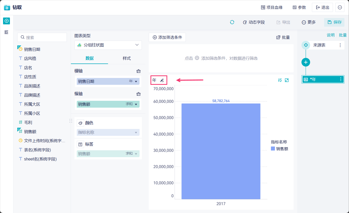 3)选择柱状图,将「销售日期」字段拖入维度栏,将「销售额」字段拖入指标栏,将「销售日期」字段按照「年」分组。如下图所示: