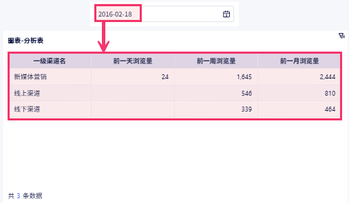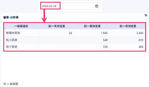 本文用渠道浏览量数据来演示,动态的展示前一天/前一周/前一月的浏览量数据(即筛选出 2016-03-31 浏览量、2016-04-01 前一周的总浏览量、2016-04-01 前三十天总浏览量)。如下图所示: