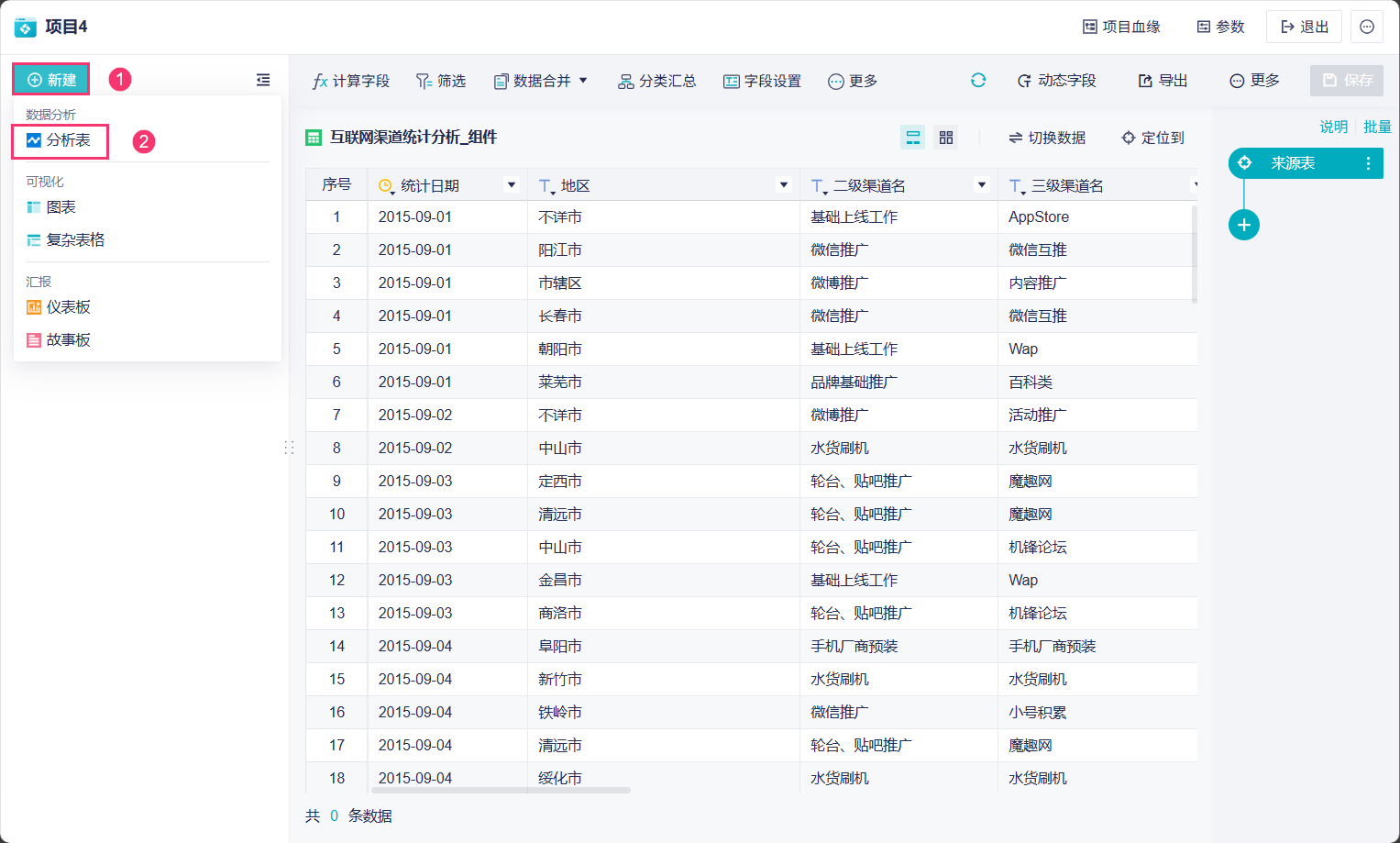 下载并上传示例数据,使用示例数据创建分析表。如下图所示: