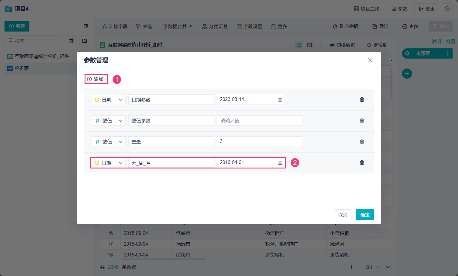 2)点击「添加」按钮新增一个日期参数的字段,命名为「天_周_月」。可以先设置一个日期,在后面的计算中将使用这个值先进行计算,也可以选择不输入值。 如下图所示:
