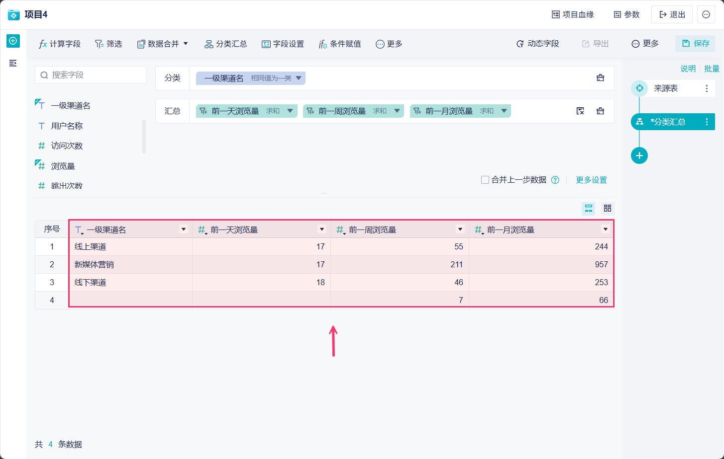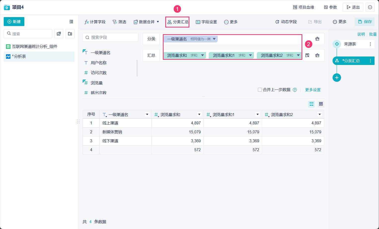 1)新增分类汇总步骤,将「一级渠道名」拖进分类栏,将「浏览量」拖入汇总栏,需要拖入三次「浏览量」字段,如下图所示: