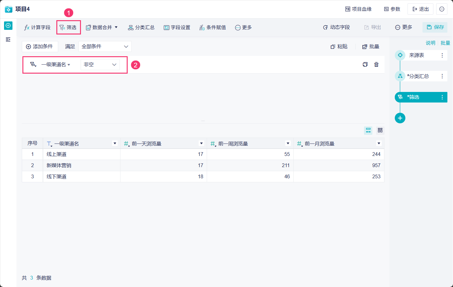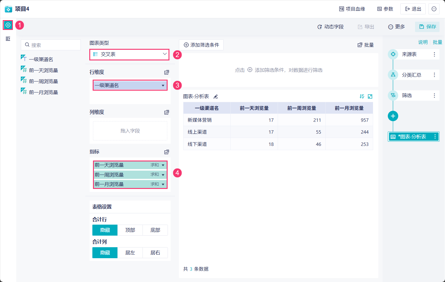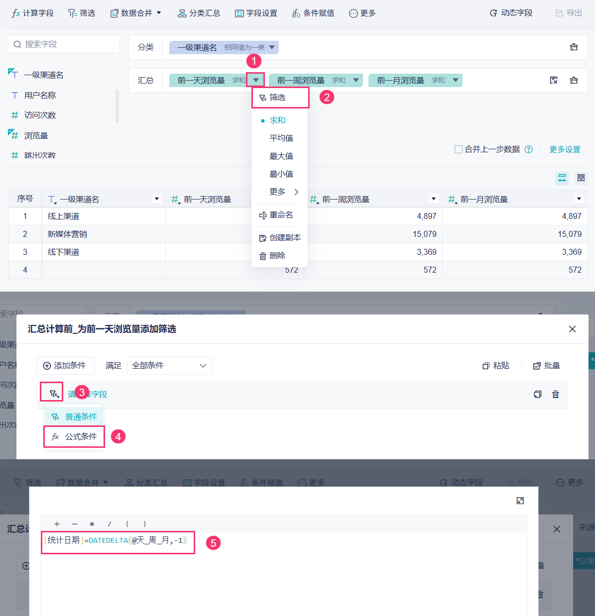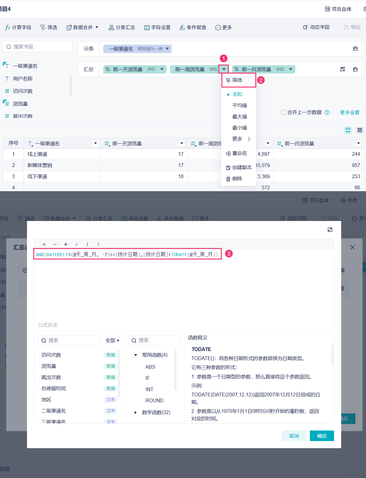 3)下面需要对三个汇总的「浏览量」字段进行筛选设置。