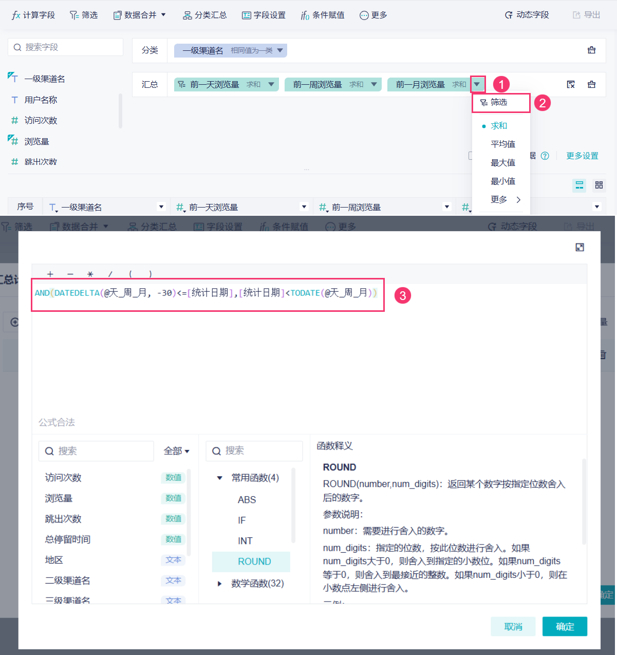 5)按照同样的步骤,对「前一月浏览量」设置汇总条件:AND(DATEDELTA(@天_周_月, -30)<=[统计日期],[统计日期]<TODATE(@天_周_月)),可以筛选出参数值前 30 天的数据并汇总,如下图所示: