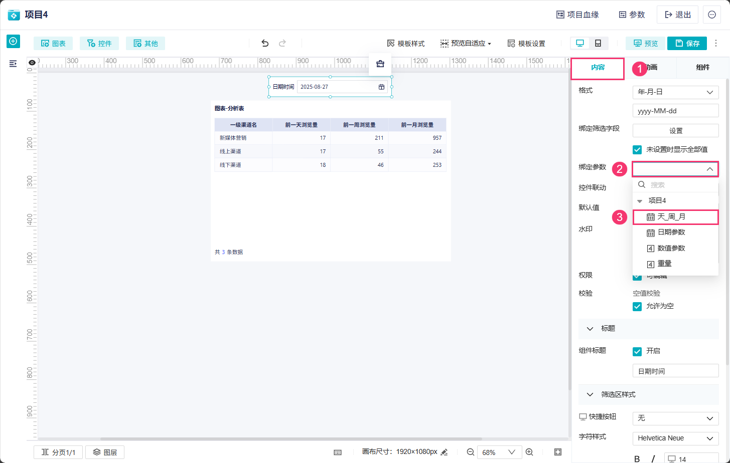 2)控件绑定 2.2 节中添加的「天_周_月」参数,如下图所示: