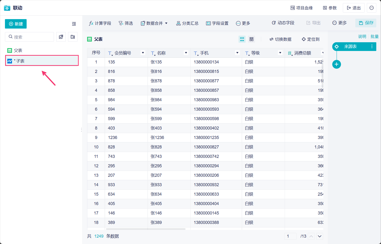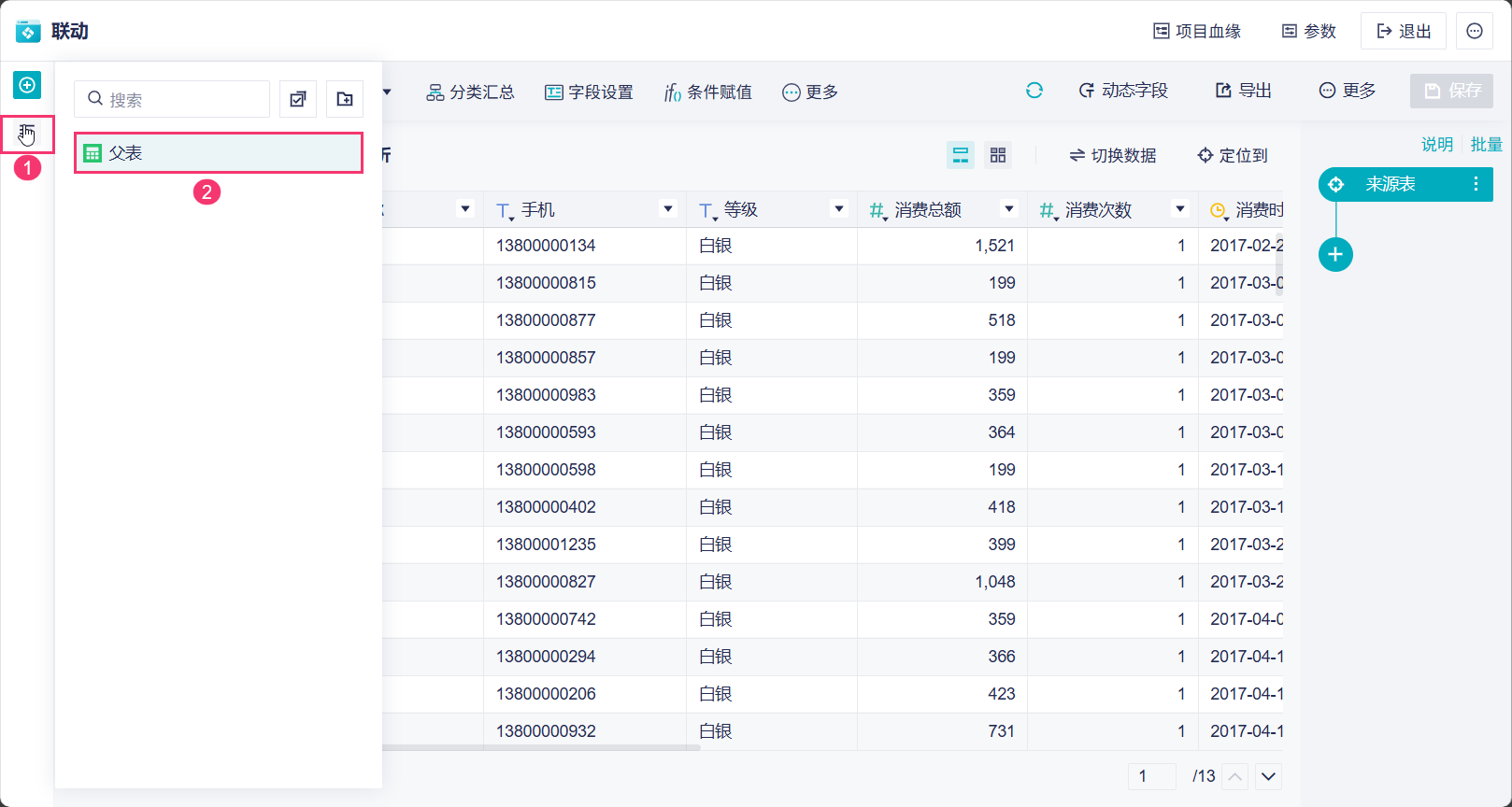 2)给这个分析表修改一下名称,命名为「父表」。如下图所示: