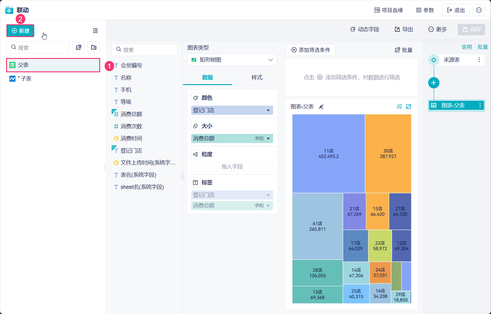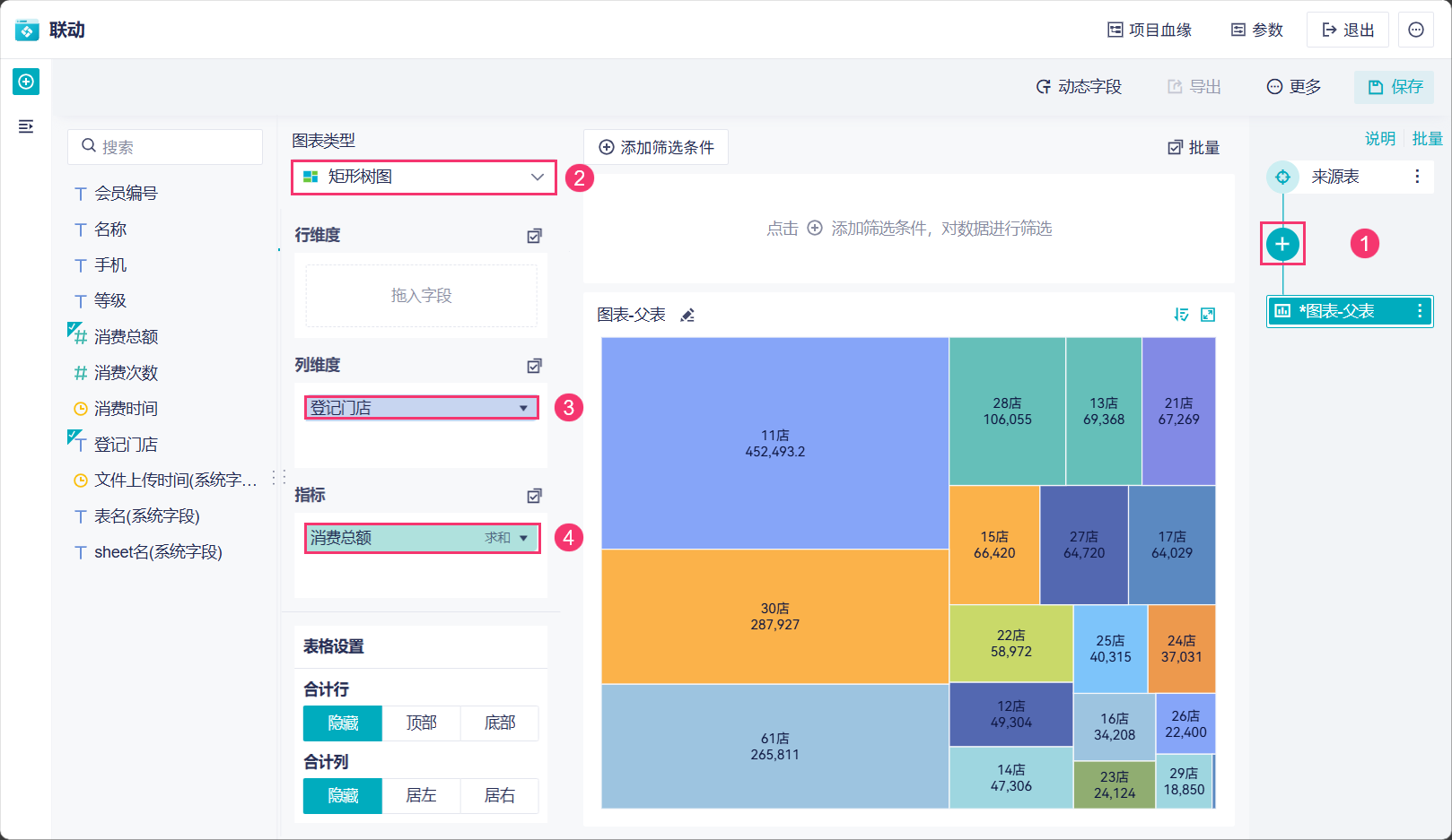 3)点击「+」,添加图表,选择制作一张矩形树图,展示每个门店的消费情况。如下图所示: