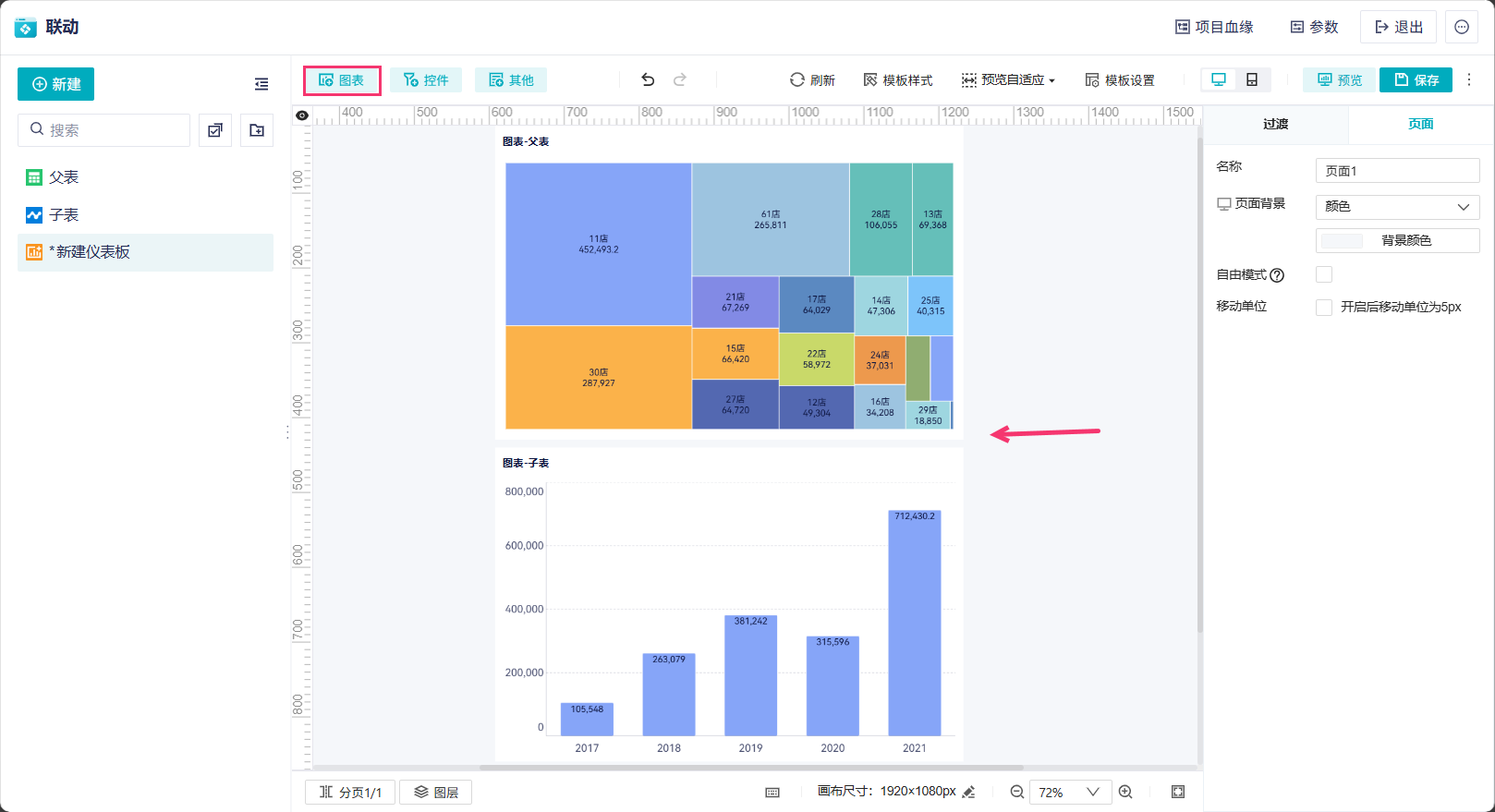 1)创建一张仪表板,将父表和子表的图表都拖入仪表板中。如下图所示: