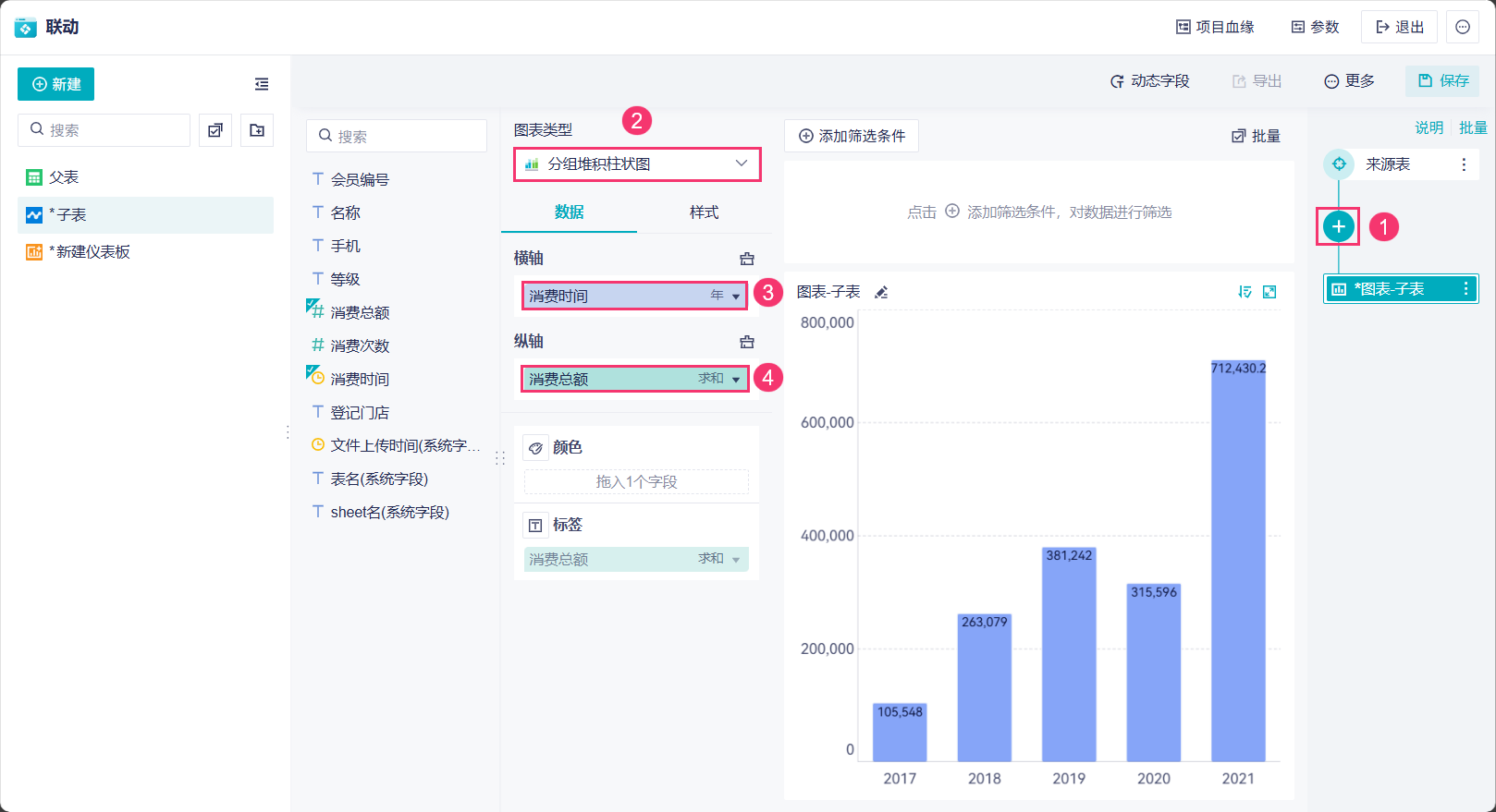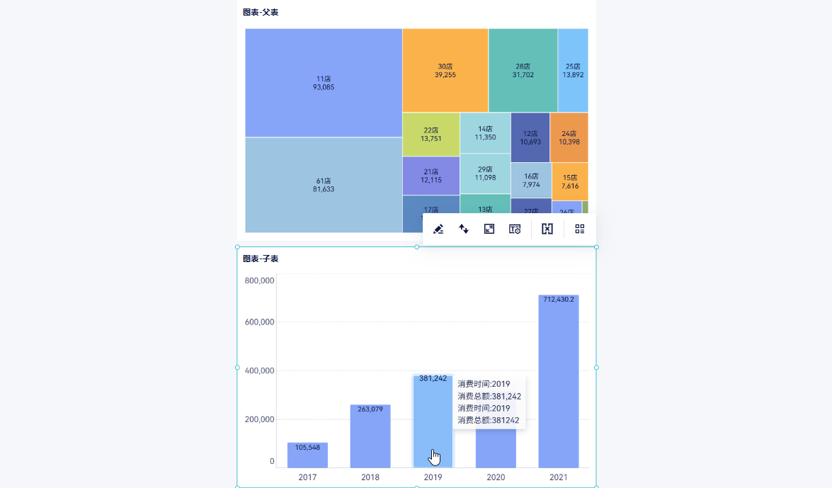 2)子表的图表是可以联动父表的图表的,点击 2019 年的柱子,那么就可以联动展示出 2019 年每个店铺的消费额。如下图所示: