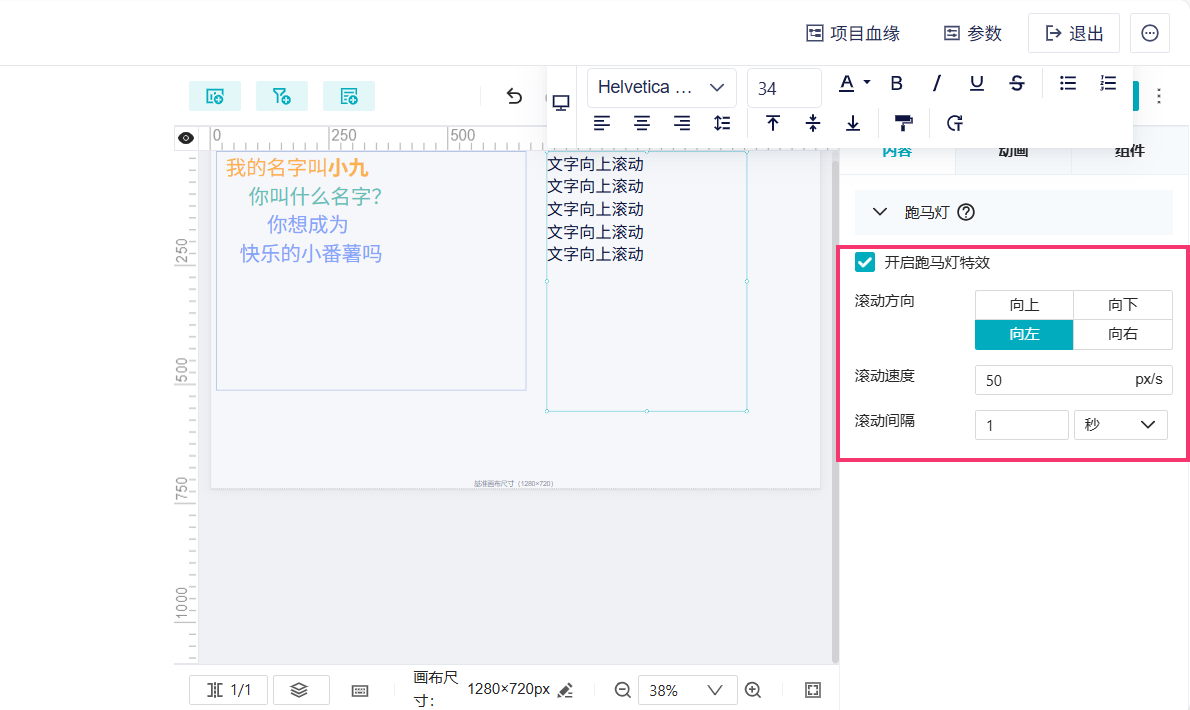 支持「开启跑马灯特效」,实现文字整体滚动的效果。如下图所示: