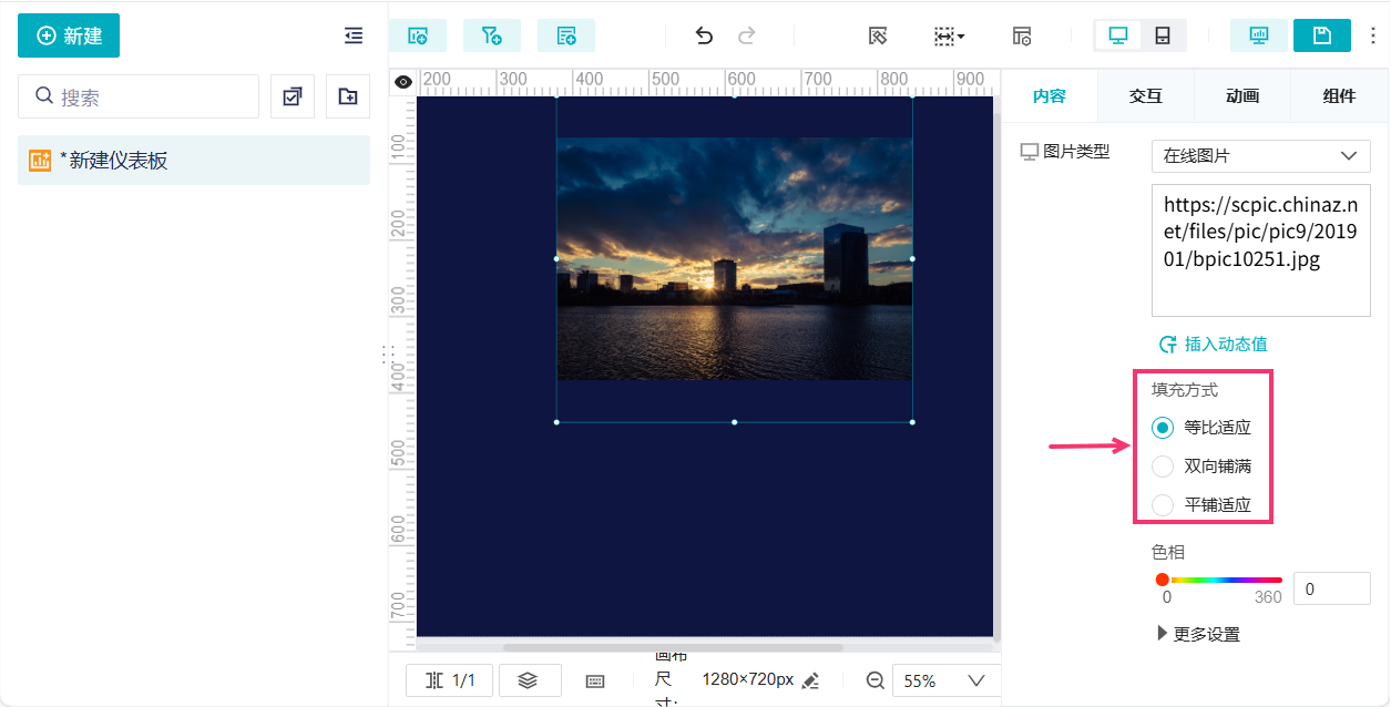 选择图片后,支持设置图片的「填充方式」和「色相」。