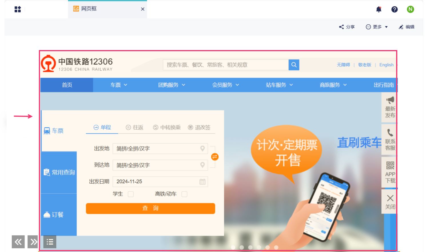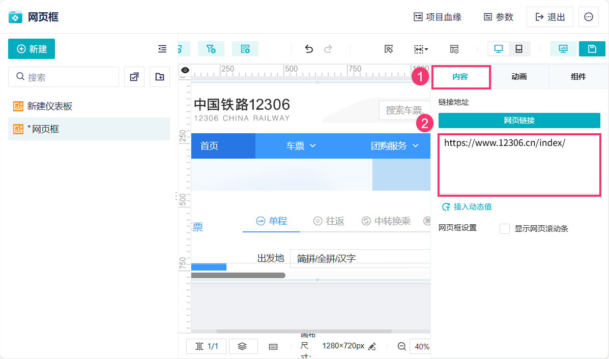 用户希望在仪表板界面中添加链接,展示网页等 Web 界面时,可使用「网页框」组件。如下图所示: