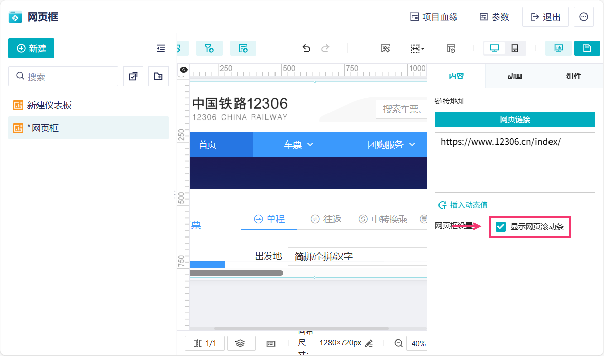 若不勾选「显示网页滚动条」,隐藏滚动条。网页框中引入的网页,不支持上下左右滚动查看网页内容。如下图所示:
