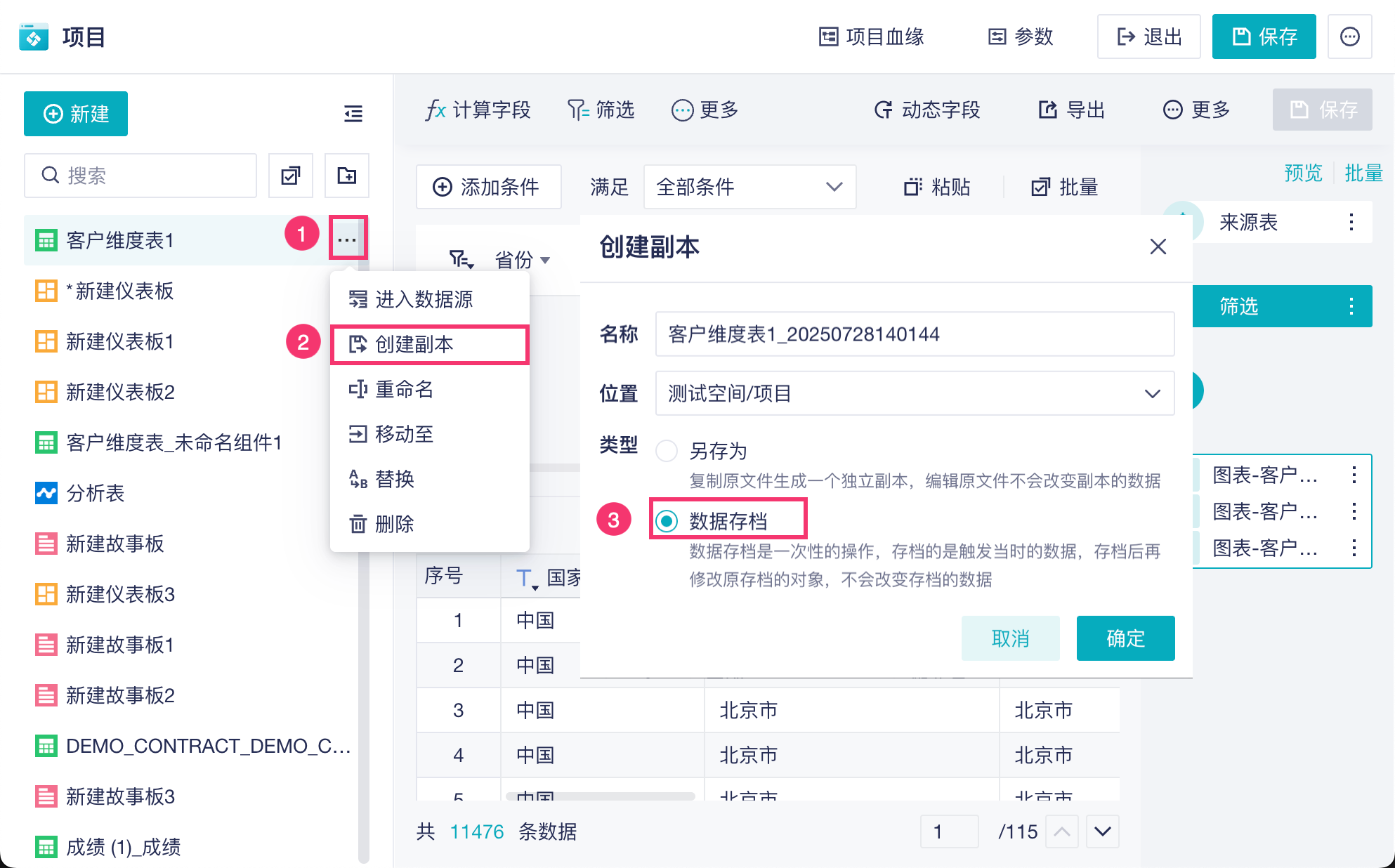 1)以数据表为例,进入项目编辑界面,下拉点击「创建副本」,如下图所示: