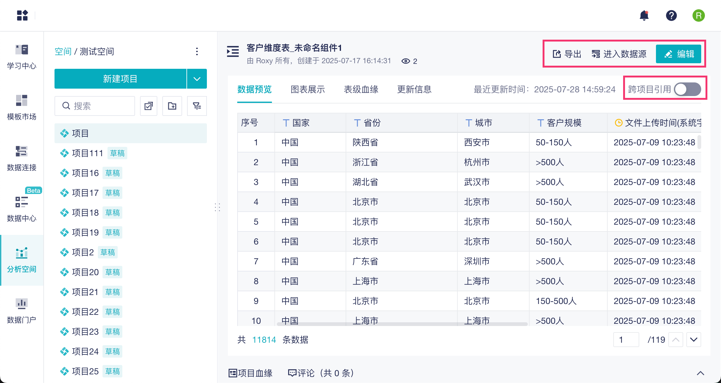 | 跨项目引用 | 开启按钮后,可以在不同的项目之间使用该分析表 |