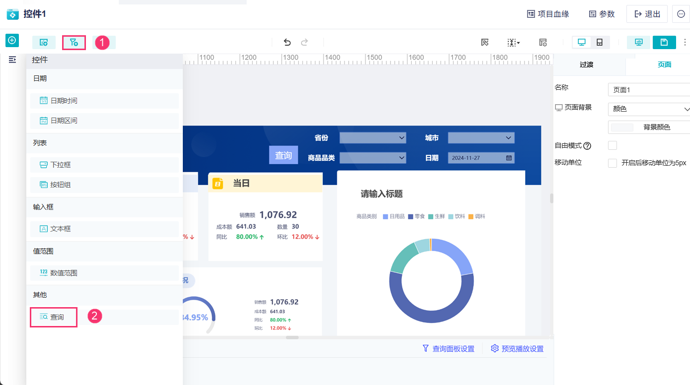 1)制作好仪表板后,点击「控件>查询」,将查询组件拖入到画布中。如下图所示: