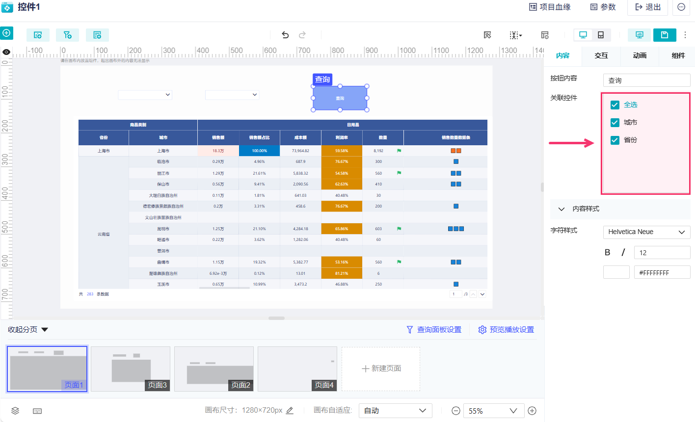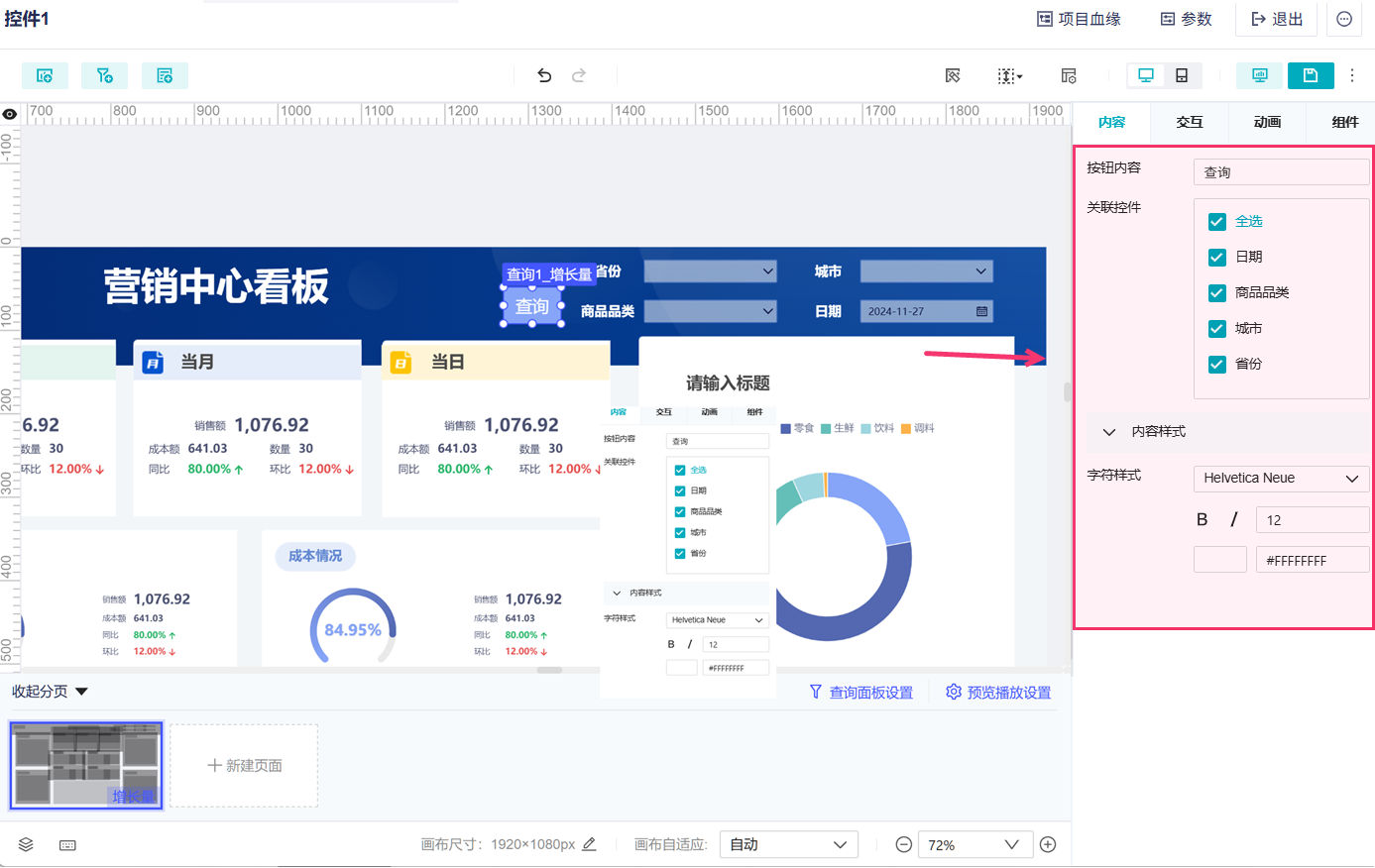 | 关联控件 | 设置哪些控件被「查询」按钮控制,不再自动查询 默认全选当前页的所有控件,后续新增的控件也将自动被选中 |