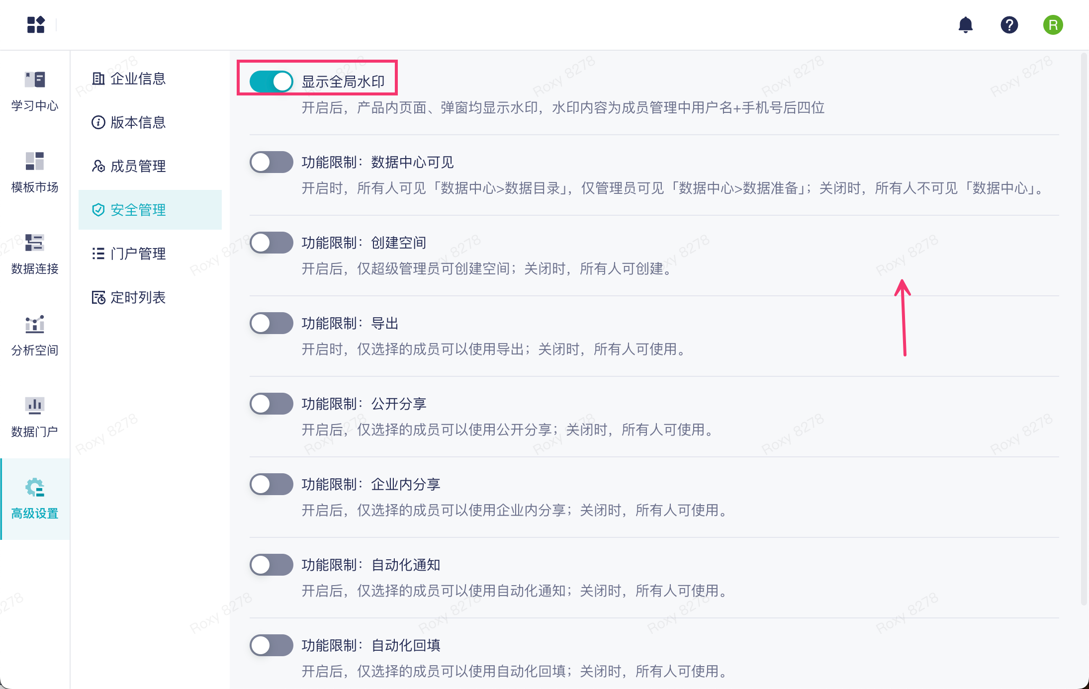 打开按钮即可显示全局水印,水印内容为成员名+手机号后四位。若信息泄露,可根据水印追溯数据的来源。效果如下图所示: