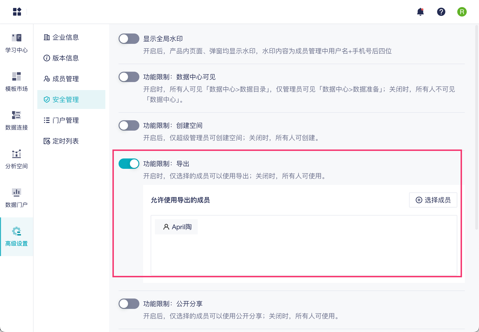 1)「功能限制-导出」功能可以对分析表、仪表板、故事板的导出权限进行控制: