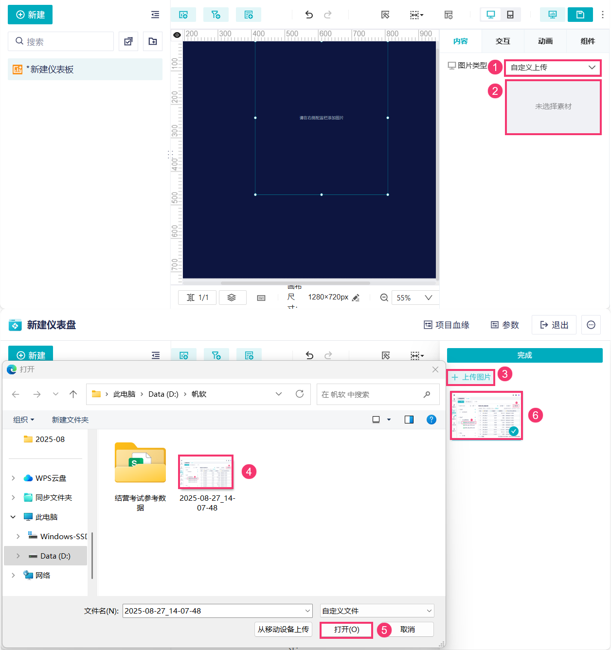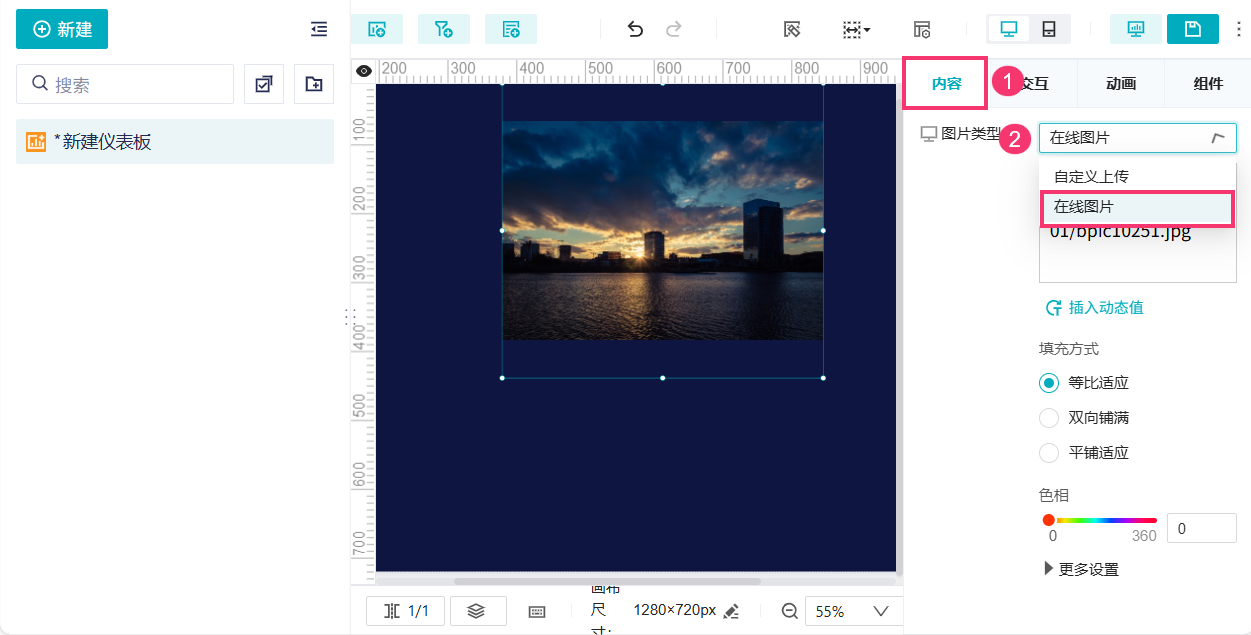 用户可将自己本地准备好的素材图片上传至仪表板中,并使用它。