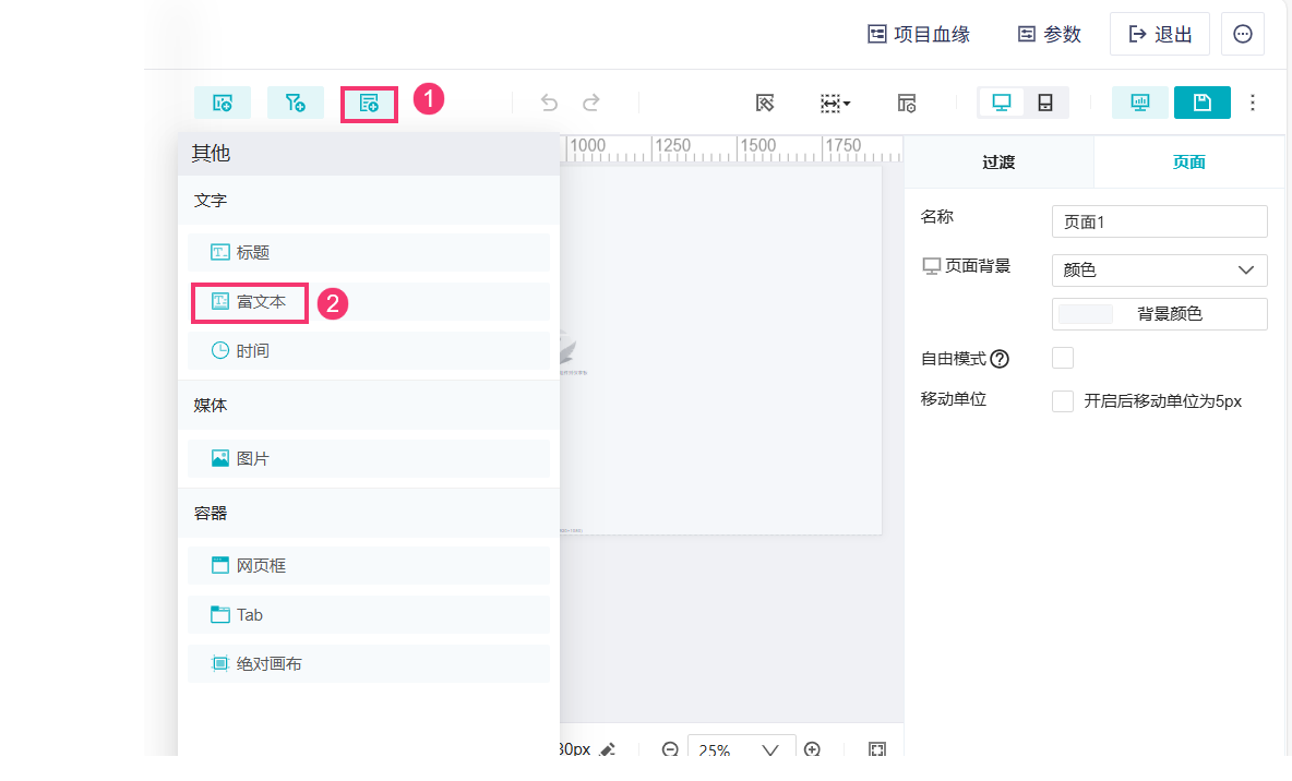 1)点击功能栏「其他>富文本」,将其添加到页面中。如下图所示: