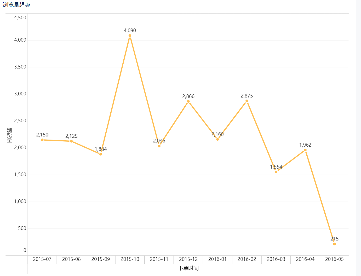 折线图(Line Chart)用于显示数据在一个连续的时间间隔或者时间跨度上的变化,它的特点是反映事物随时间或有序类别而变化的趋势。在折线图中,一般水平轴(X轴)用来表示时间的推移,并且间隔相同;而垂直轴(Y轴)代表不同时刻的数据的大小。如下图展示了随着时间年月的浏览量变化。
