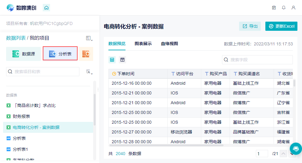 点击绿色的“数据源”,选择“上传Excel”,选择需要上传的数据进行上传。
