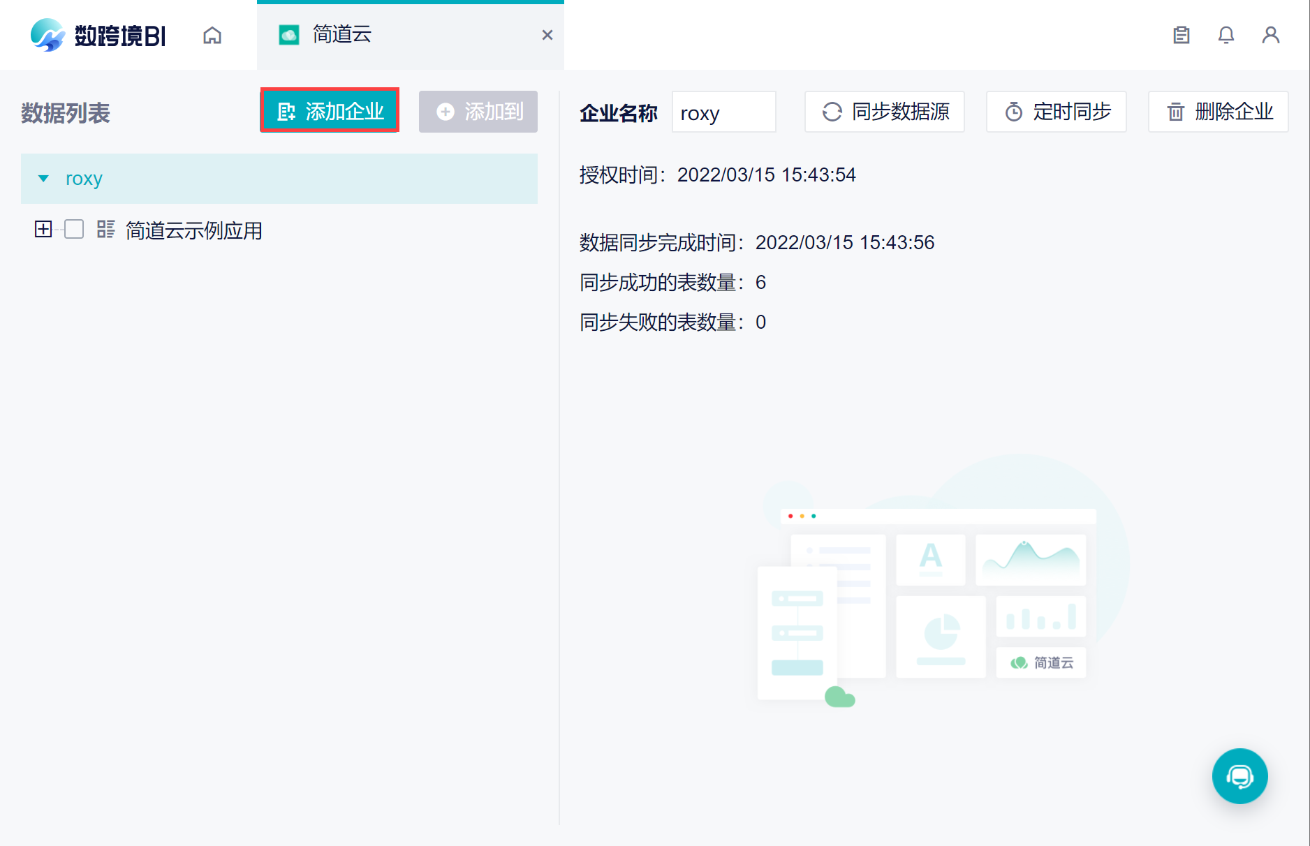 1)在简道云数据管理界面内连接简道云企业数据,点击「添加企业」。
