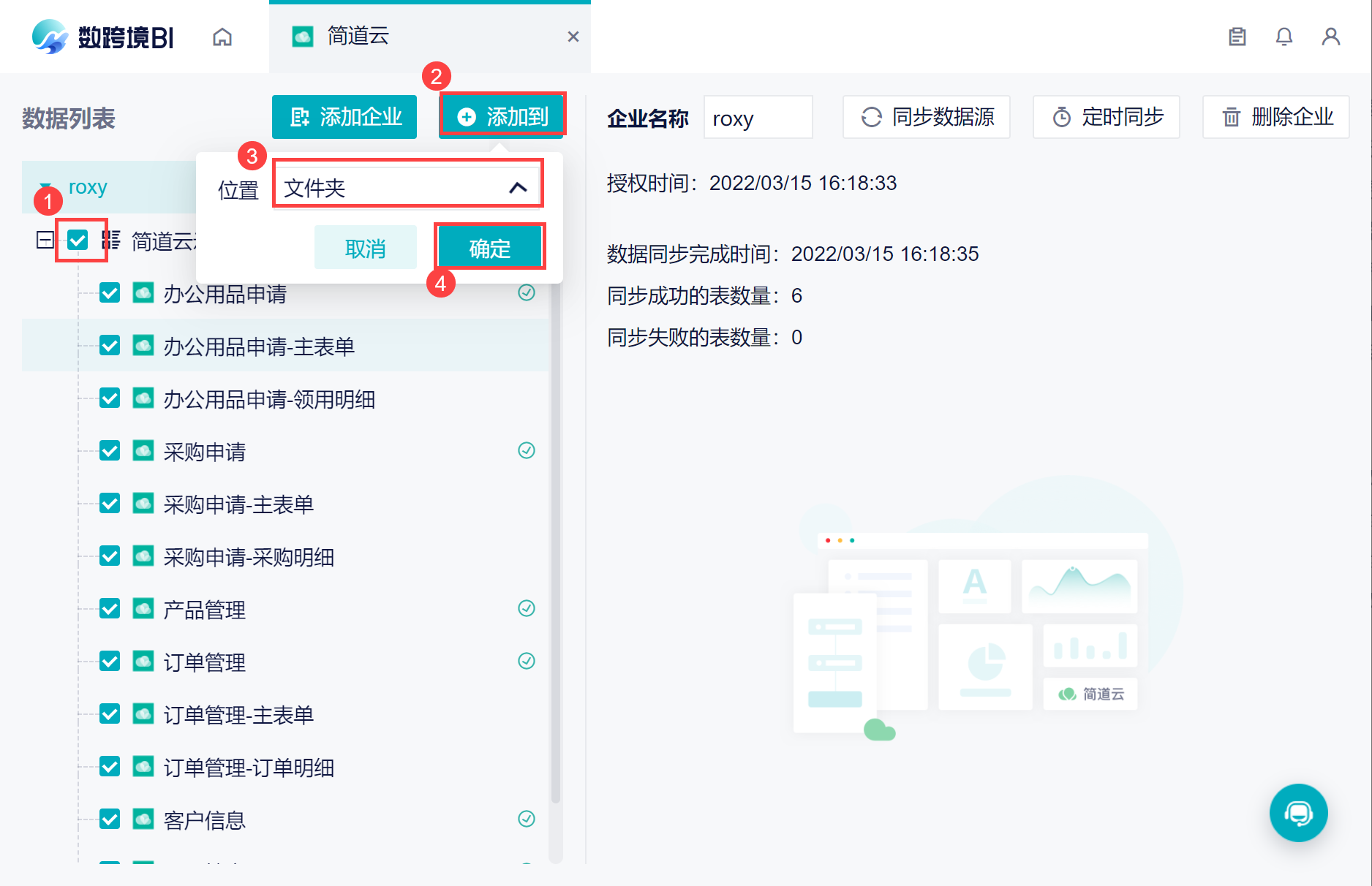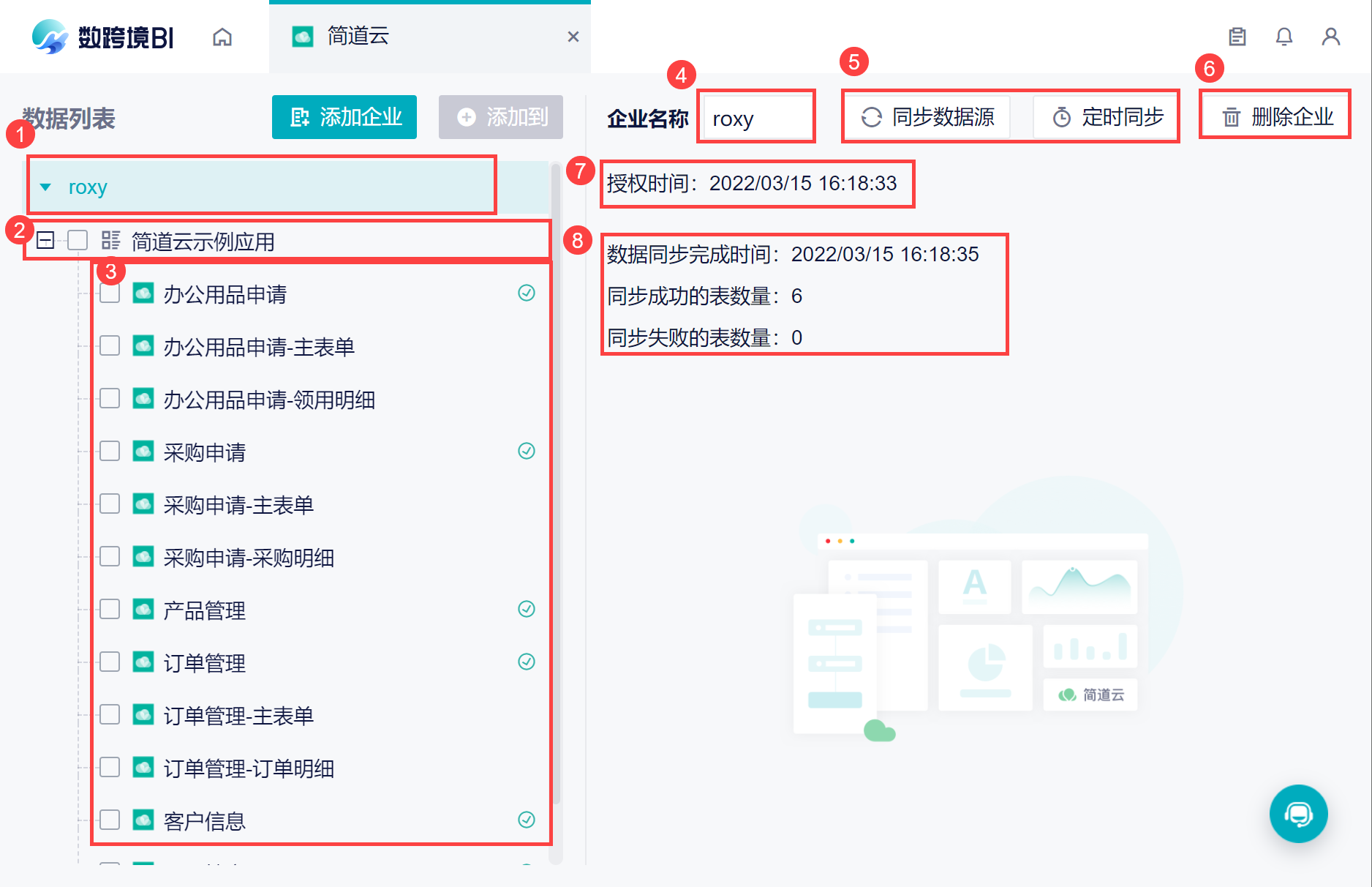 选择要添加的简道云企业名,并选择需要添加的表。如下图所示: