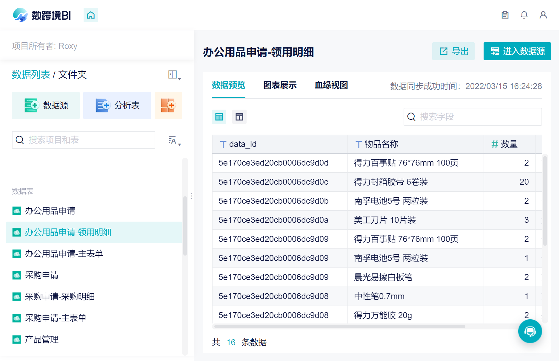 | 3 | 数据表 | 点击方框,勾选表单;点击表名,查看表单数据 注:若简道云表单中含有子表单,则表列表需要保留简道云原表,并拆分出主表单和每一个子表单,如图「办公用品申请」表。 |