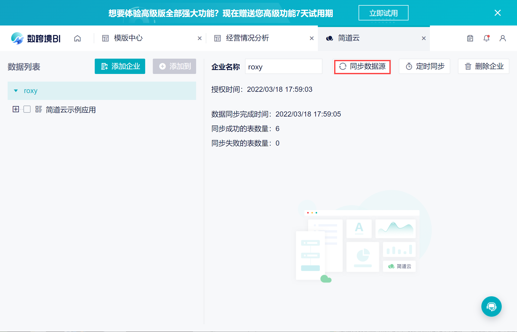 选择需要同步更新的企业,点击「同步数据源」,完成后,会显示数据同步的信息。