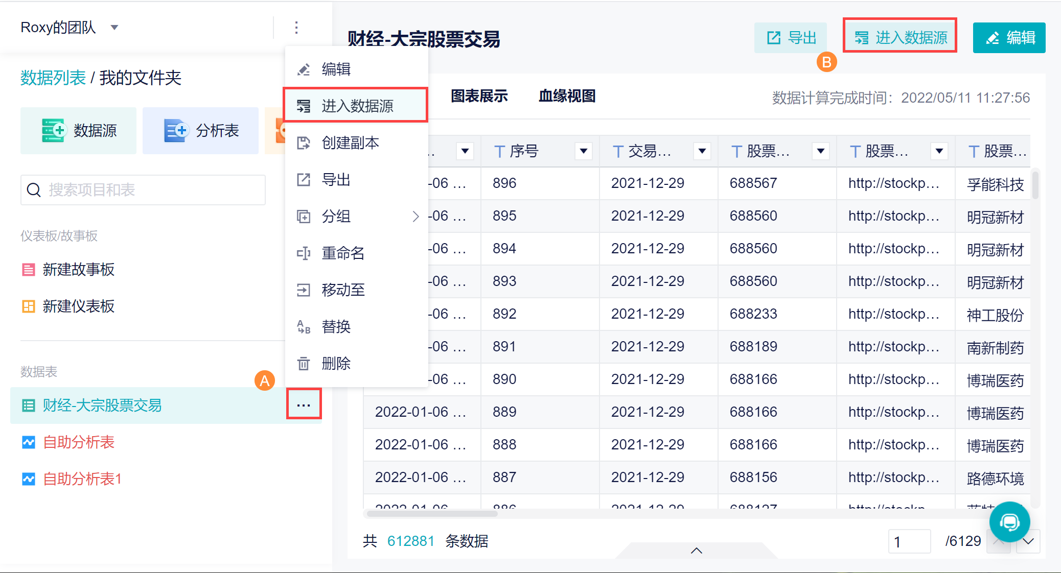 如果你想要修改原始的 Excel 数据,可以选择对应的数据表,点击「...>更新 Excel」,或者直接在页面右上角点击「更新 Excel」,即可替换或者追加 Excel 数据,如下图所示: