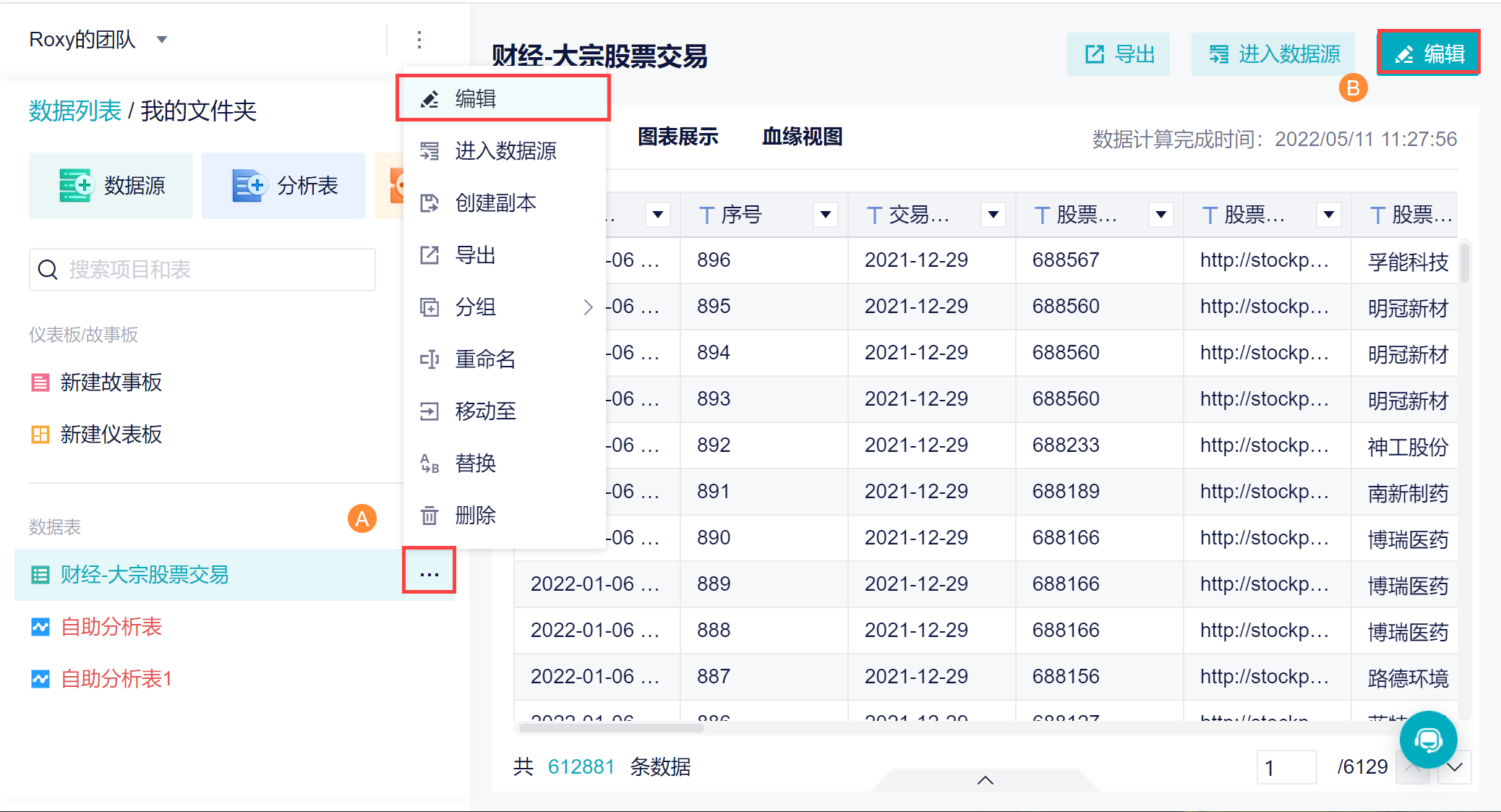 选择对应的数据表,点击「...>编辑」,或者直接在页面右上角点击「更新 Excel」,如下图所示: