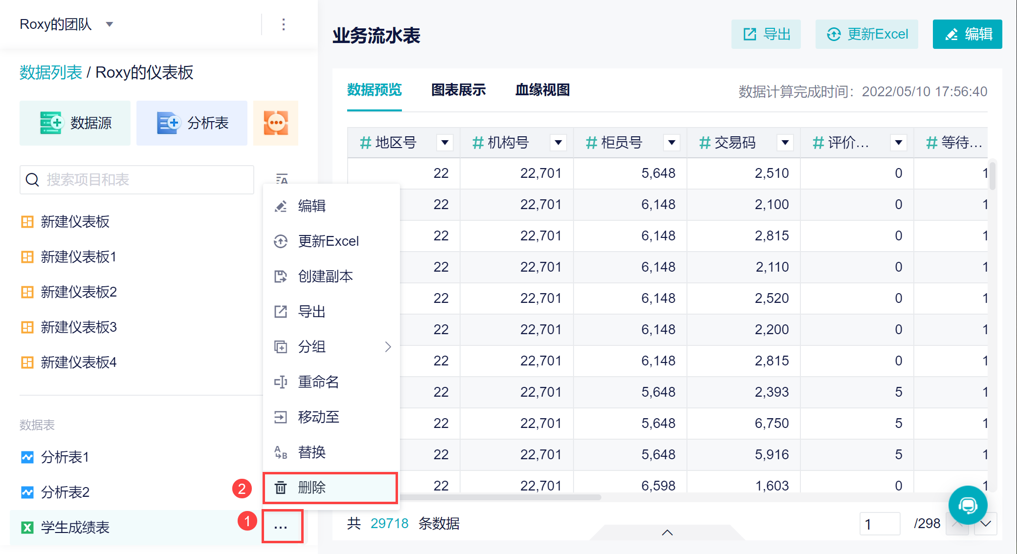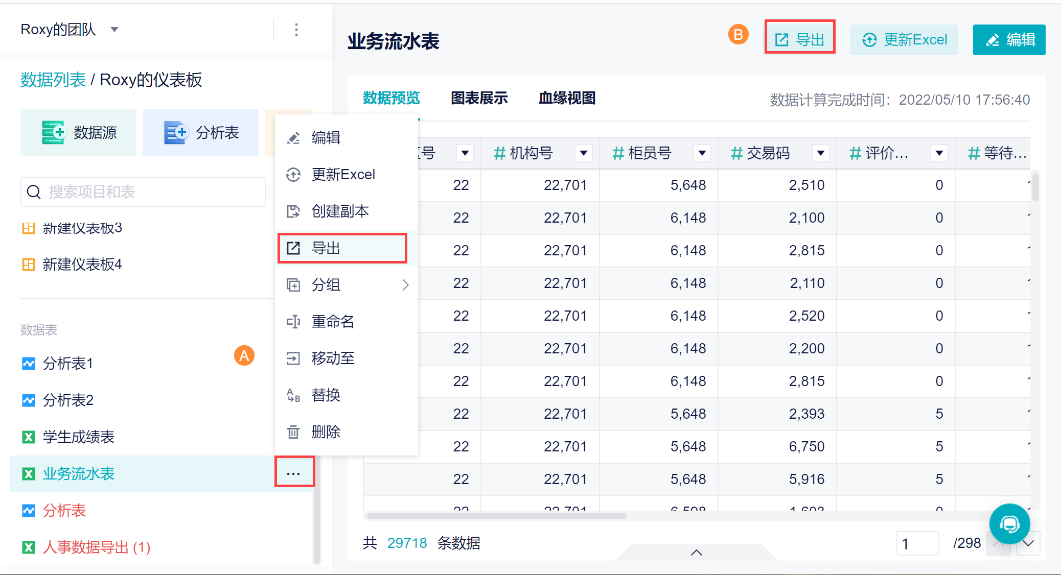 可以通过「导出功能」,将已经处理好的数据表导出成 Excel ,如下图所示: