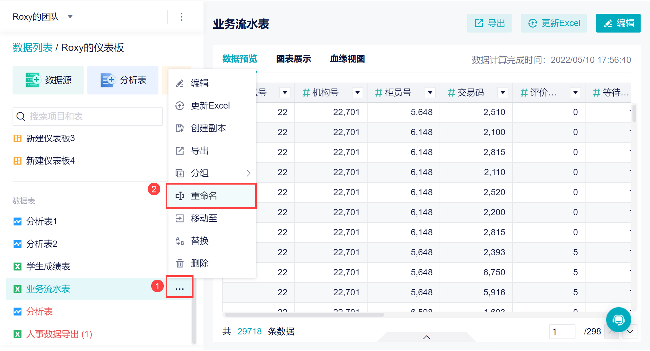 可以对基础表使用重命名修改数据表名称,如下图所示: