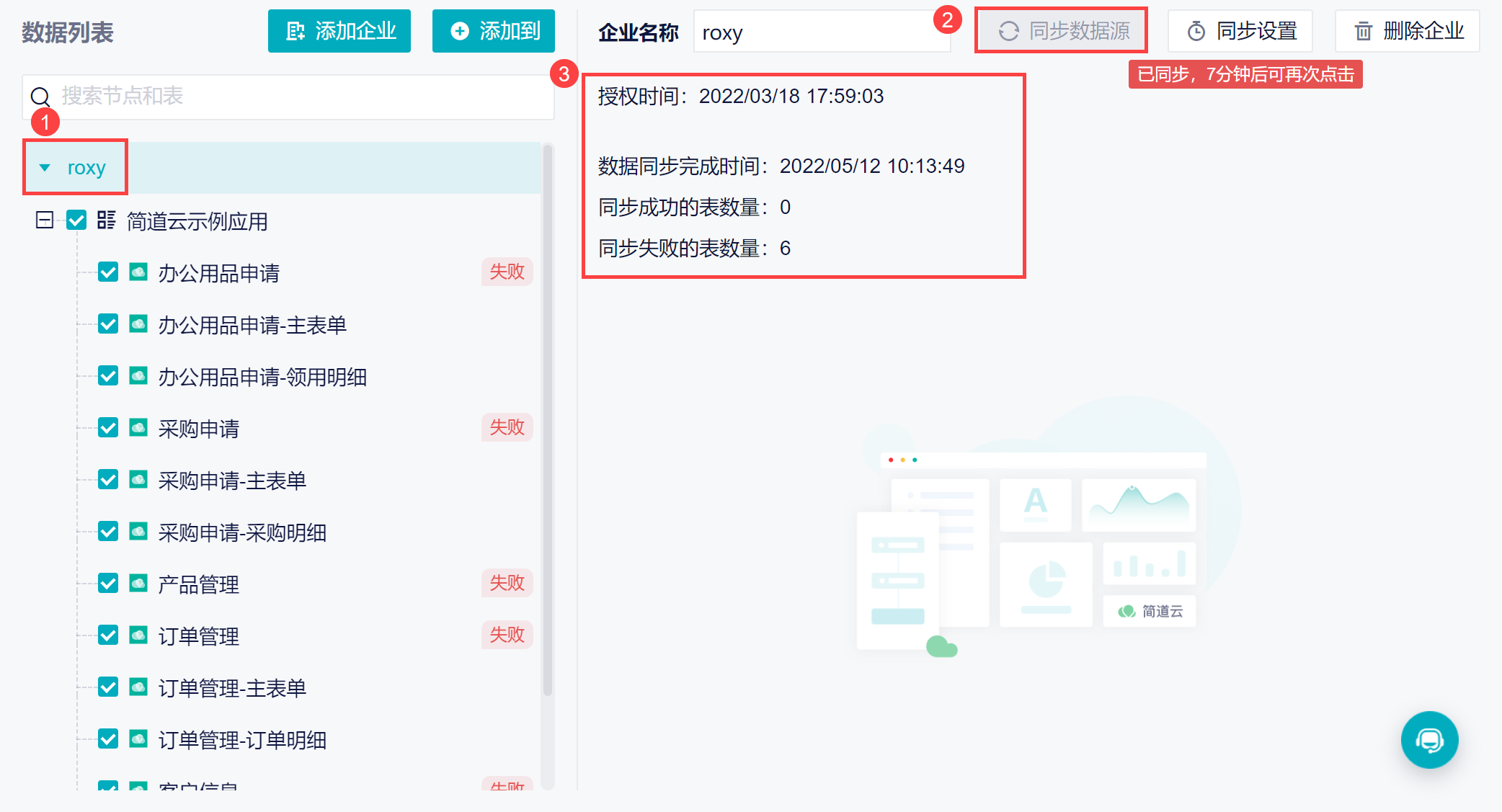 同步数据有两种:1)同步数据源:点击立即开始同步;2)同步设置:可以设置定时同步的时间和执行评率,3.5.6 版本支持设置简道云表单数据实时同步。