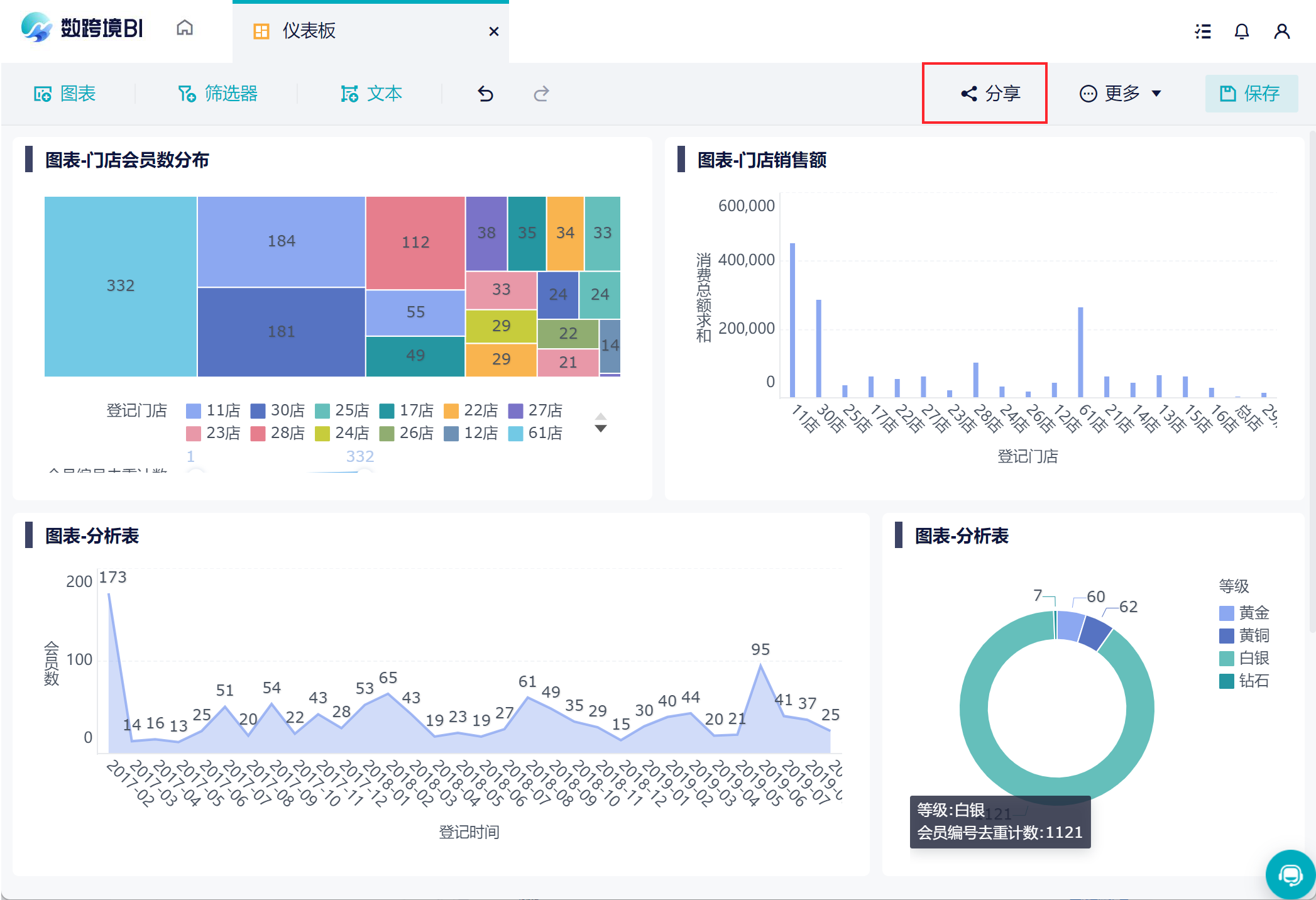 进入仪表板界面,点击右上角的「分享」按钮。如下图所示: