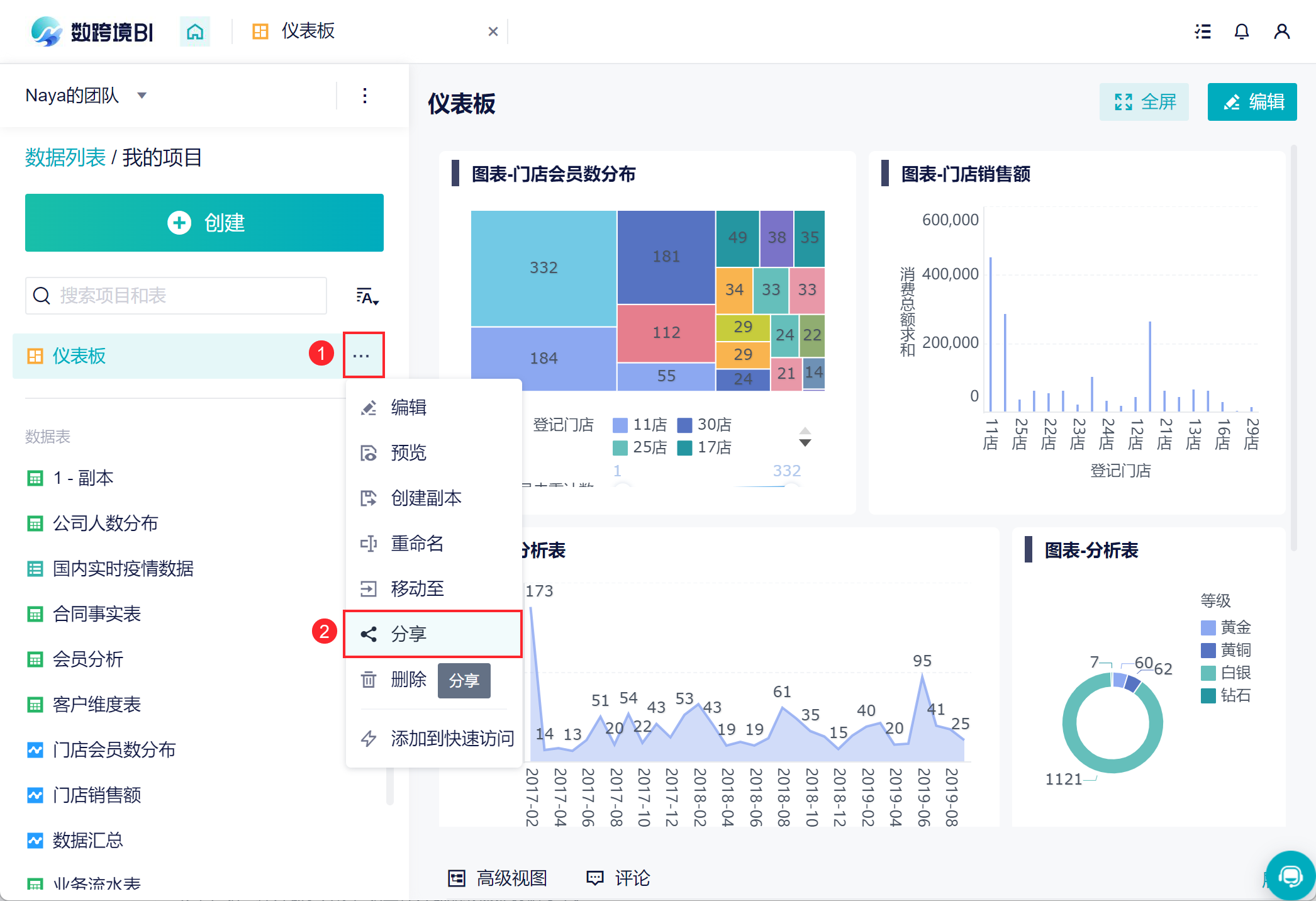 在项目内选择要分享的仪表板,点右侧「···」,选择「分享」。如下图所示: