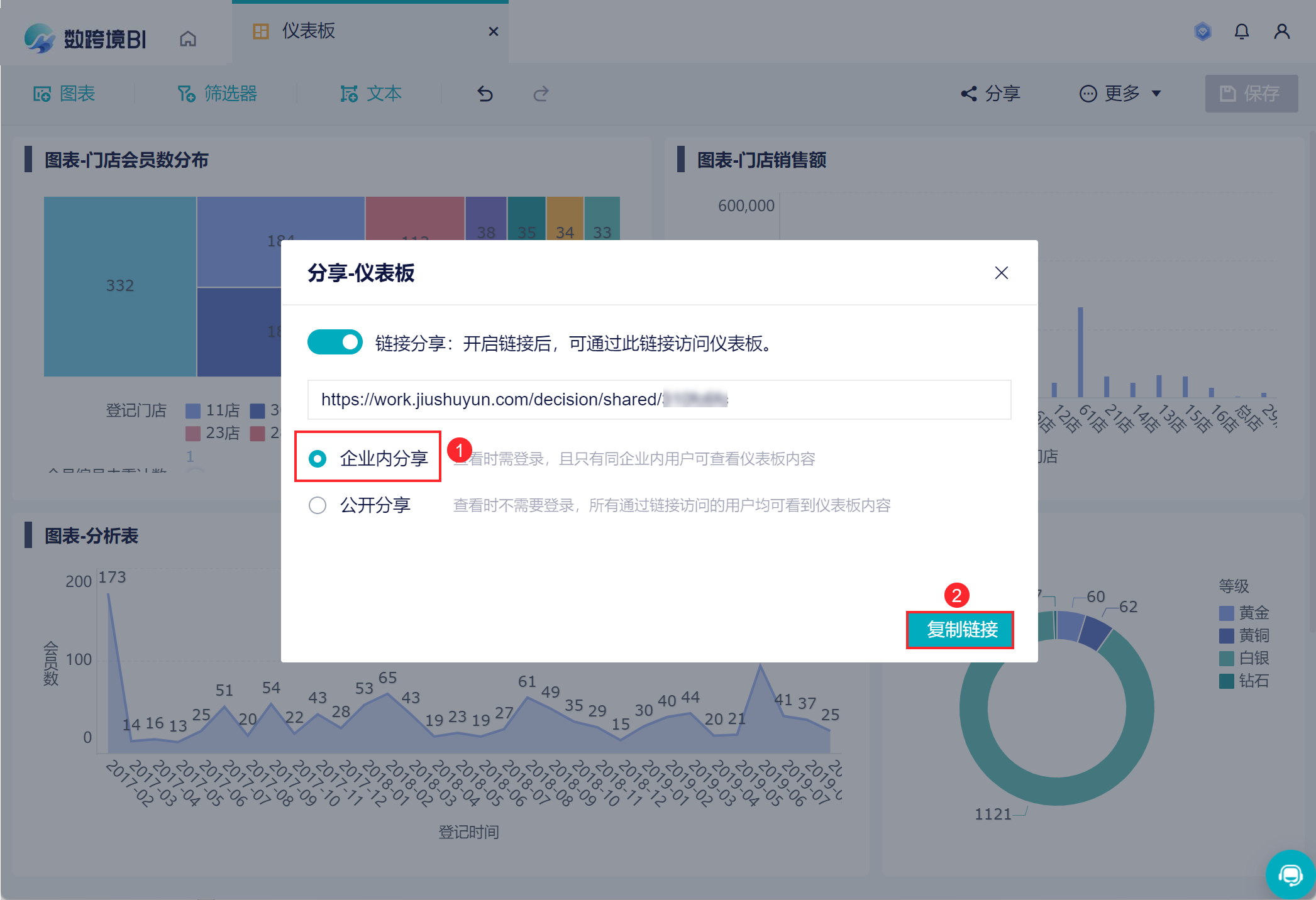 选择「企业内分享」,点击「复制链接」,将此链接发送给想要分享的用户。查看时需要登录,只有同企业内用户可查看仪表板内容。