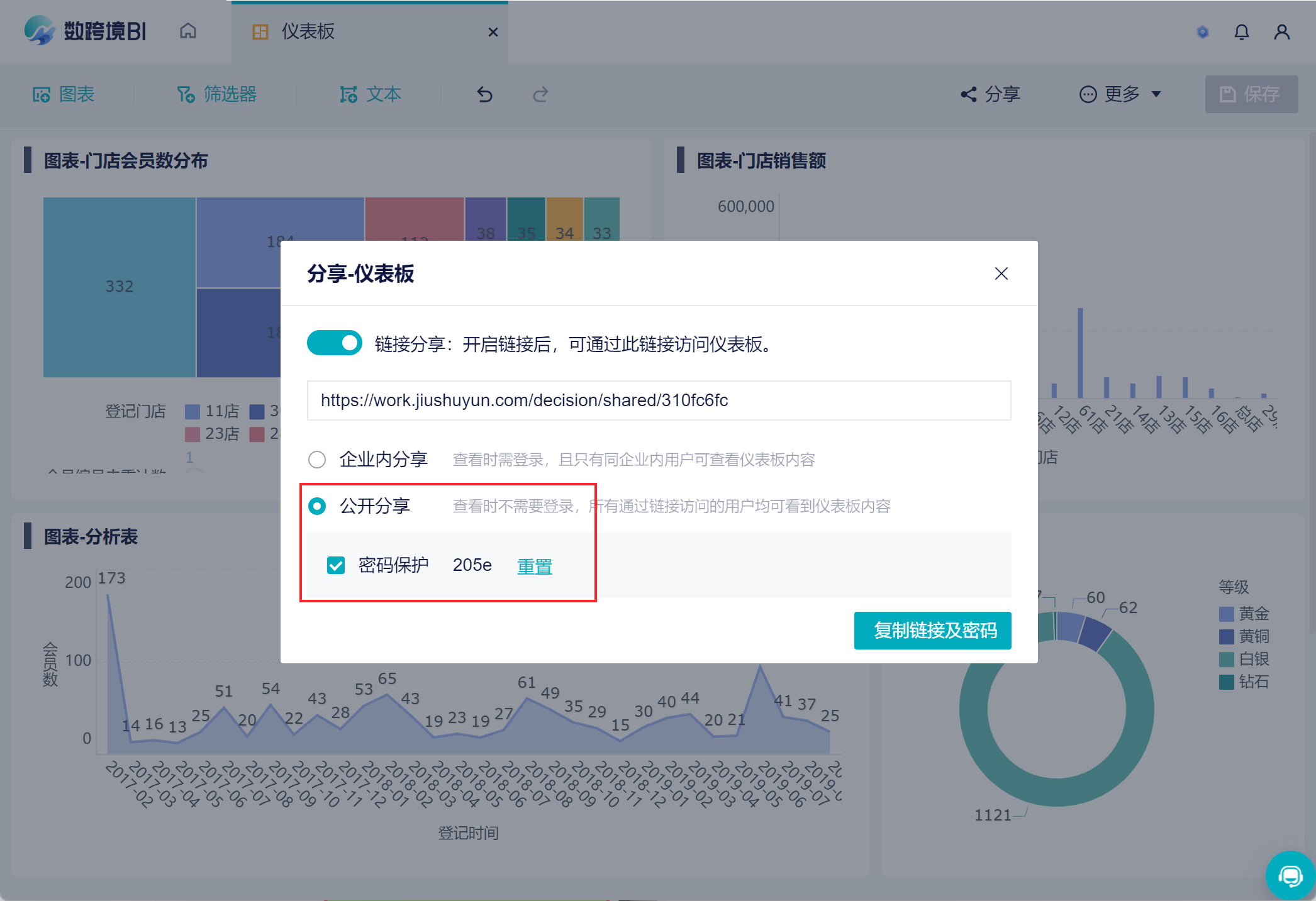 公开分享:查看时不需要登录,所有通过链接访问的用户均可看到仪表板内容。可以设置密码保护。