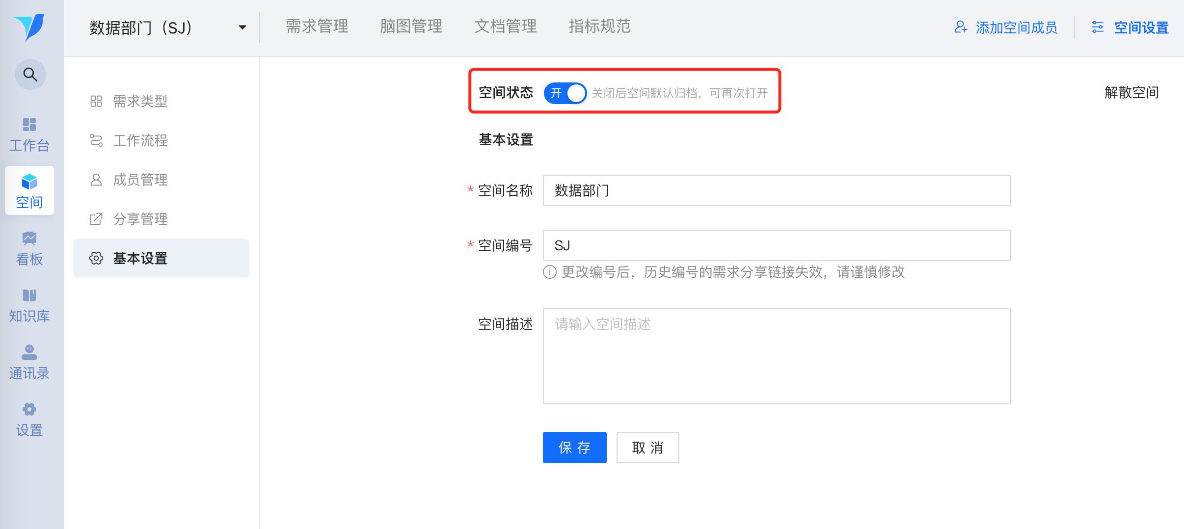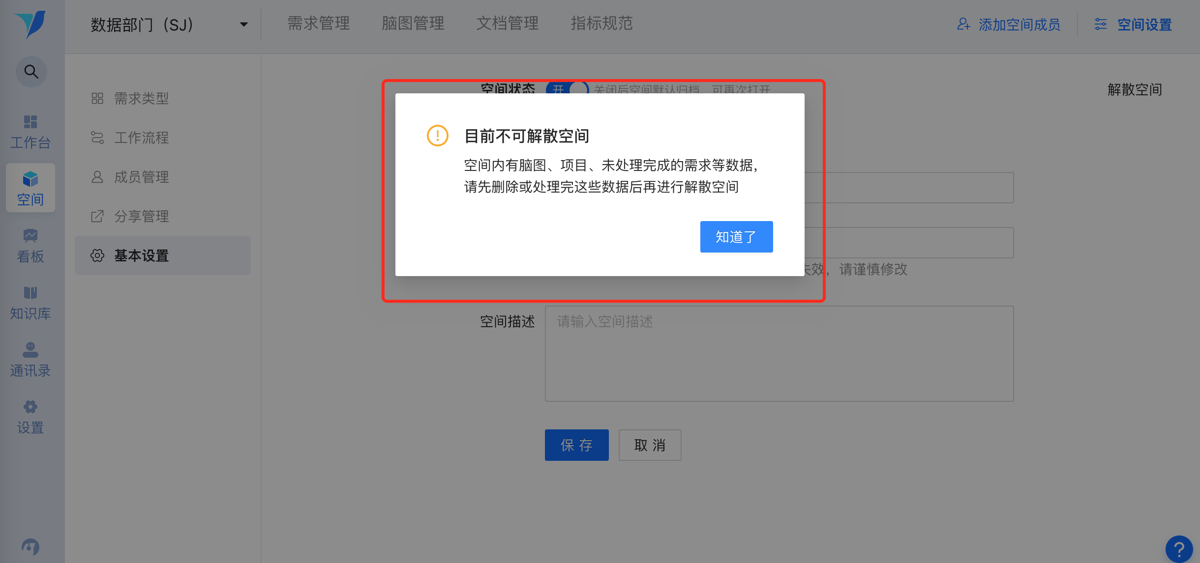 当空间内有脑图、项目、未处理完成的需求等数据,不可解散空间