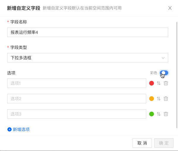 选择相应的字段类型,进行设置,此处示例为“下拉多选框”,开启【彩色】按钮,进行具体设置;若开启【色彩】后不设置具体颜色,则根据默认颜色排序