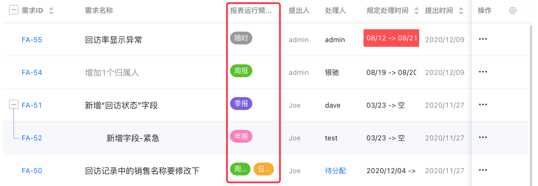 设置完成后,需求设置中选择该字段,并在相应需求中选择选项,将该类型报表全部设置自定义字段类型后,结合需求列表表头设置,可以定制更适用的需求列表