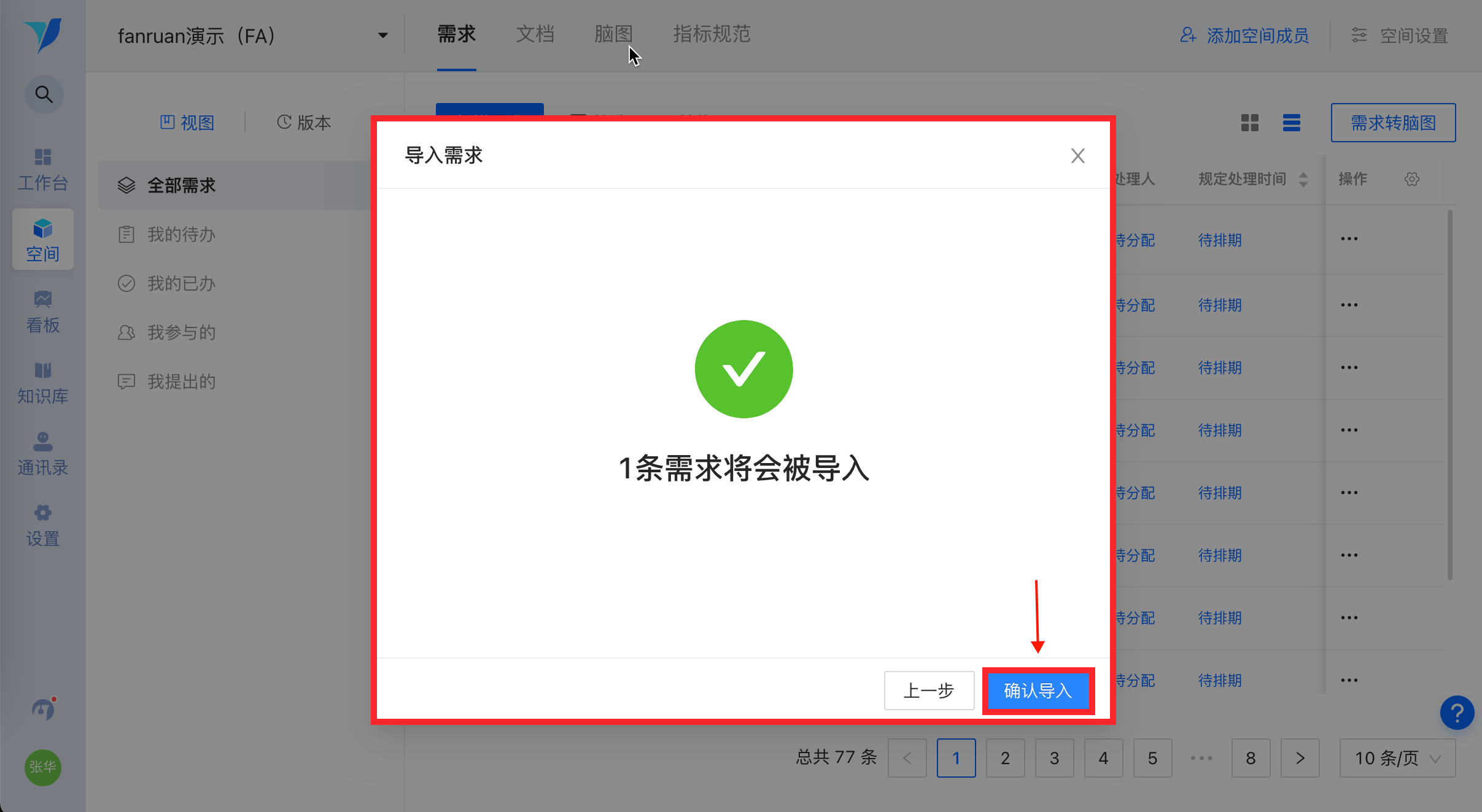 若全部成功导入,则显示“X条需求将会被导入”,点击【确认导入】